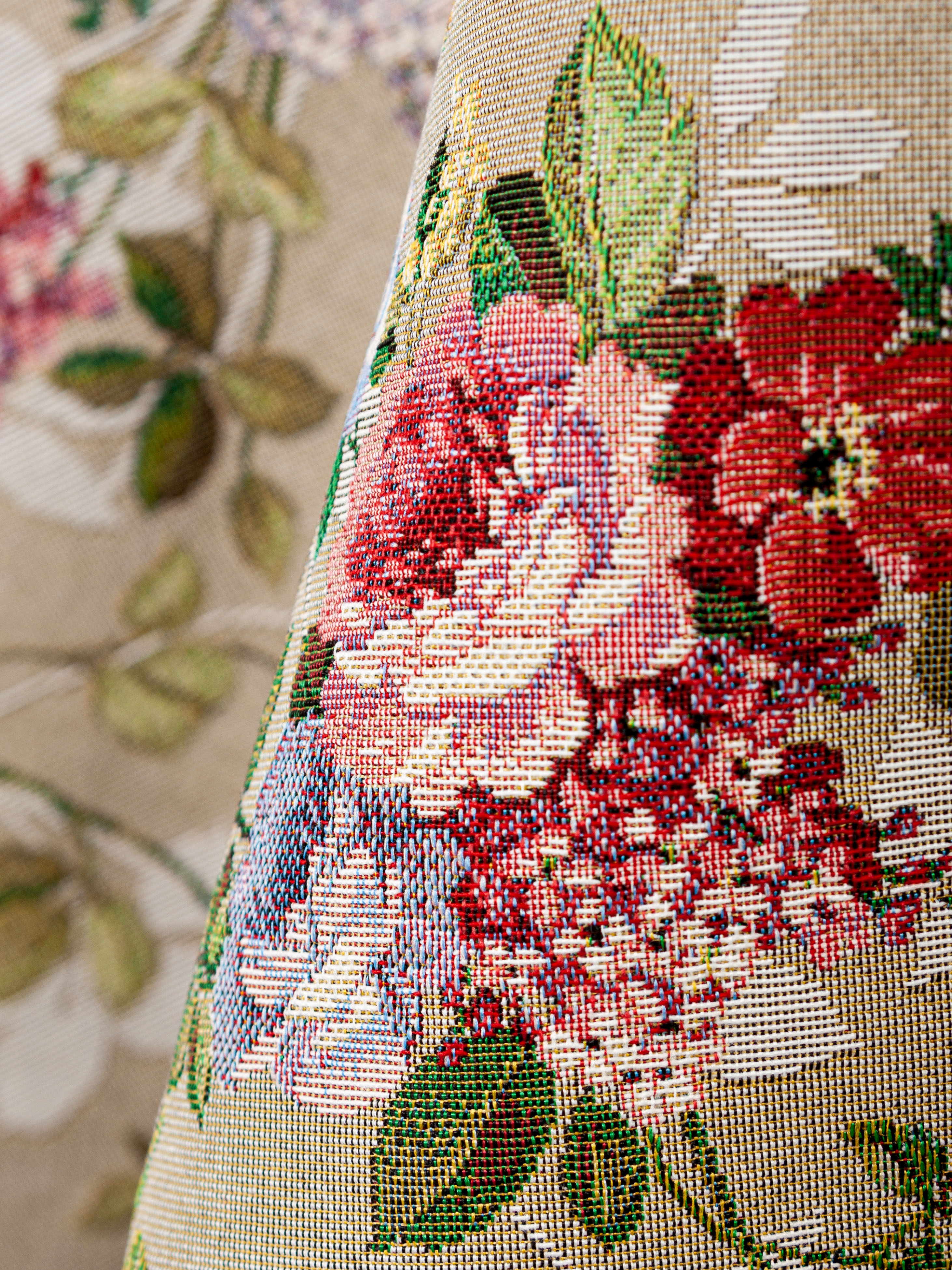 Рисунок создается переплетением нитей различных цветов и фактуры. Состав ткани: хлопок ( дающий фактуру и приятную тактильность ) и синтетические нити ( придающие износостойкость ). Плотность гобелена 410 г на кв.метр.
