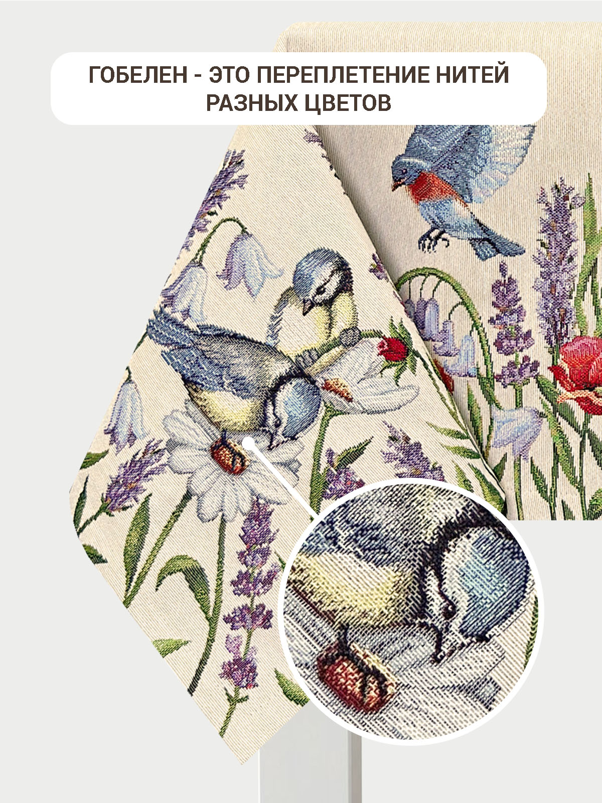 Рисунок создается переплетением нитей различных цветов и фактуры. Состав ткани: хлопок ( дающий фактуру и приятную тактильность ) и синтетические нити ( придающие износостойкость ). Плотность гобелена 410 г на кв.метр.
