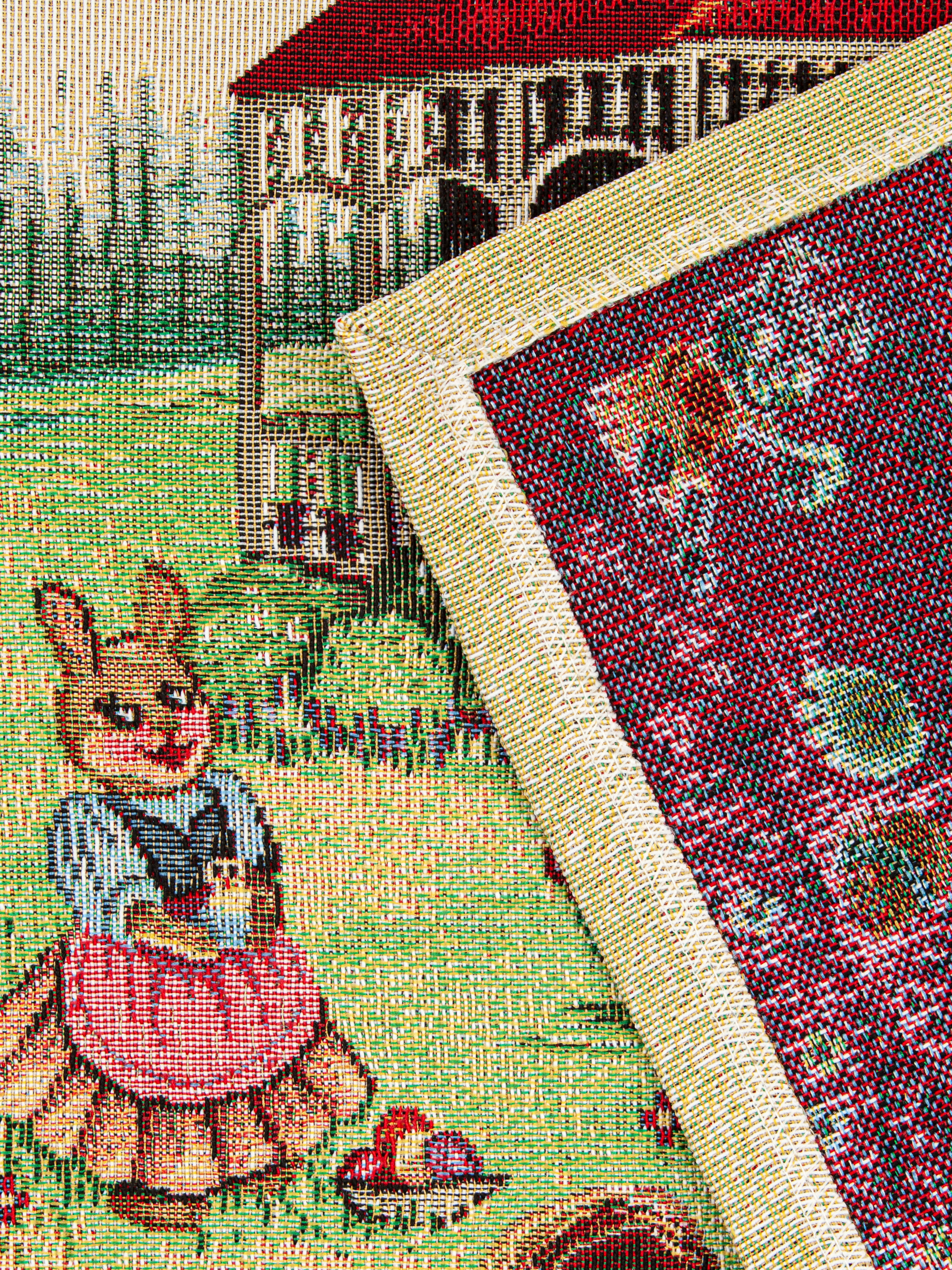 Рисунок создается переплетением нитей различных цветов и фактуры. Состав ткани: хлопок ( дающий фактуру и приятную тактильность ) и синтетические нити ( придающие износостойкость ). Плотность гобелена 410 г на кв.метр.