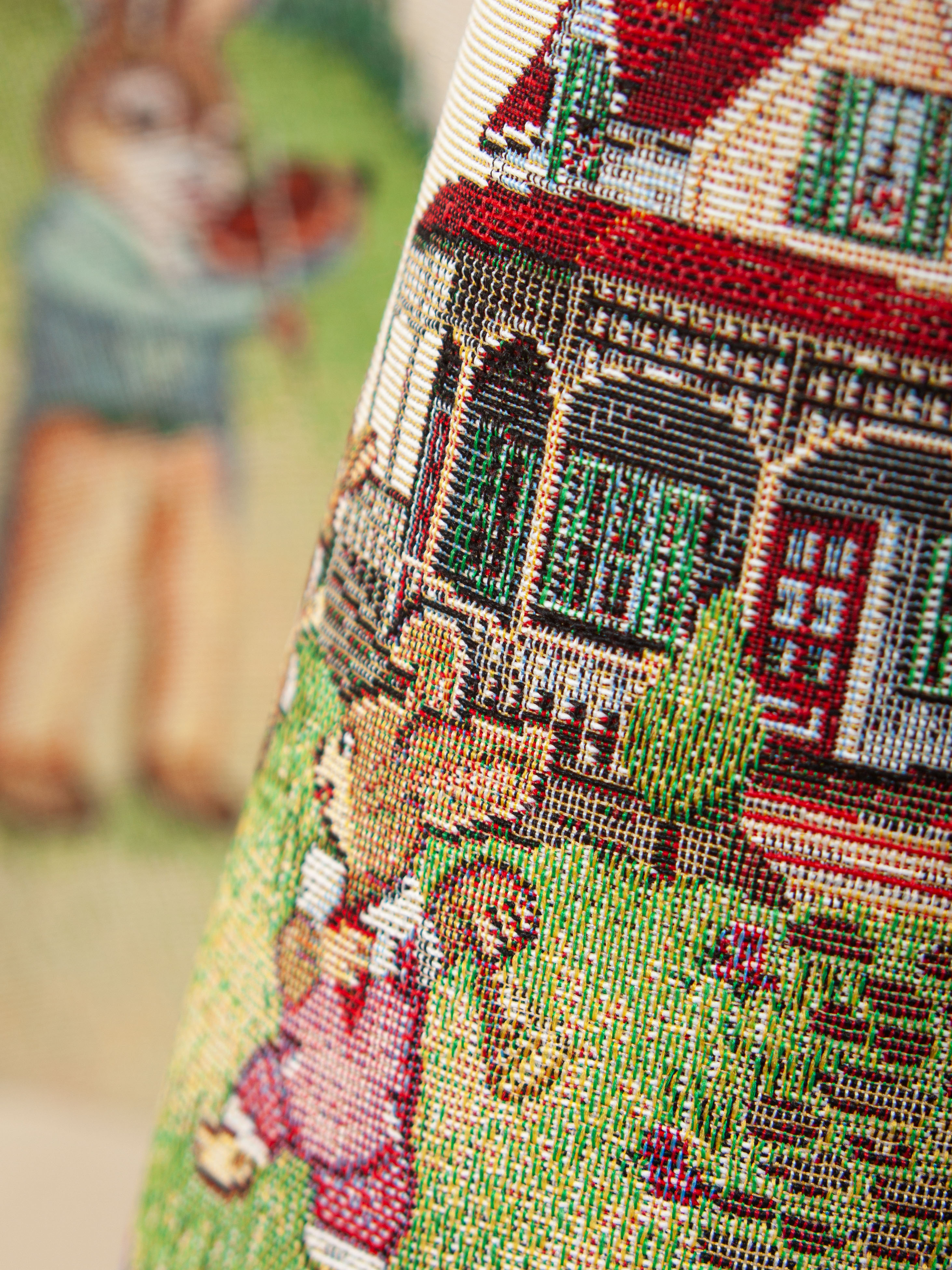 Рисунок создается переплетением нитей различных цветов и фактуры. Состав ткани: хлопок ( дающий фактуру и приятную тактильность ) и синтетические нити ( придающие износостойкость ). Плотность гобелена 410 г на кв.метр.