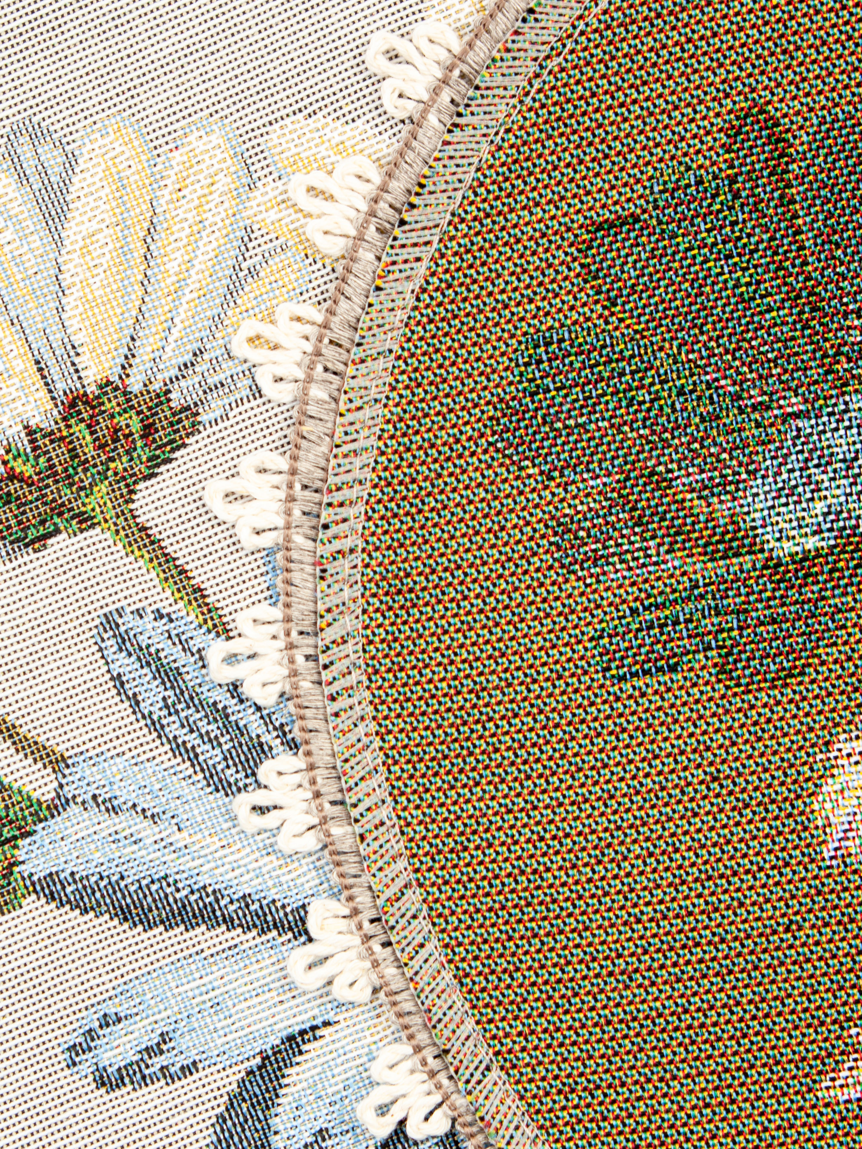 Рисунок создается переплетением нитей различных цветов и фактуры. Состав ткани: хлопок ( дающий фактуру и приятную тактильность ) и синтетические нити ( придающие износостойкость ). Плотность гобелена 410 г на кв.метр.