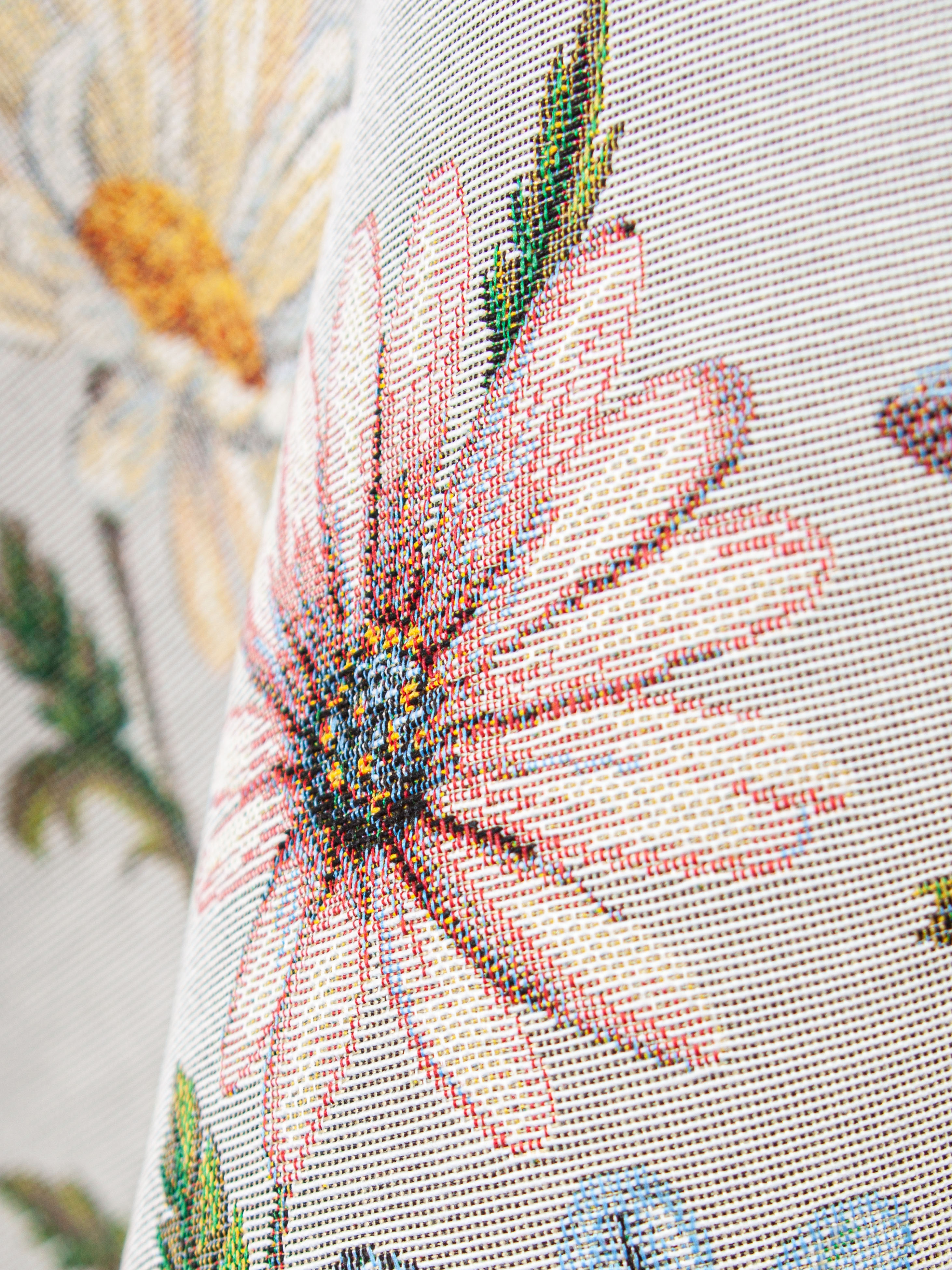 Рисунок создается переплетением нитей различных цветов и фактуры. Состав ткани: хлопок ( дающий фактуру и приятную тактильность ) и синтетические нити ( придающие износостойкость ). Плотность гобелена 410 г на кв.метр.