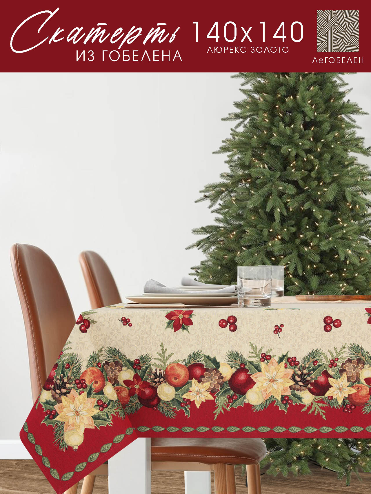 Рождественская звезда красный бордюр Скатерть 140х140 см 2310341 золото