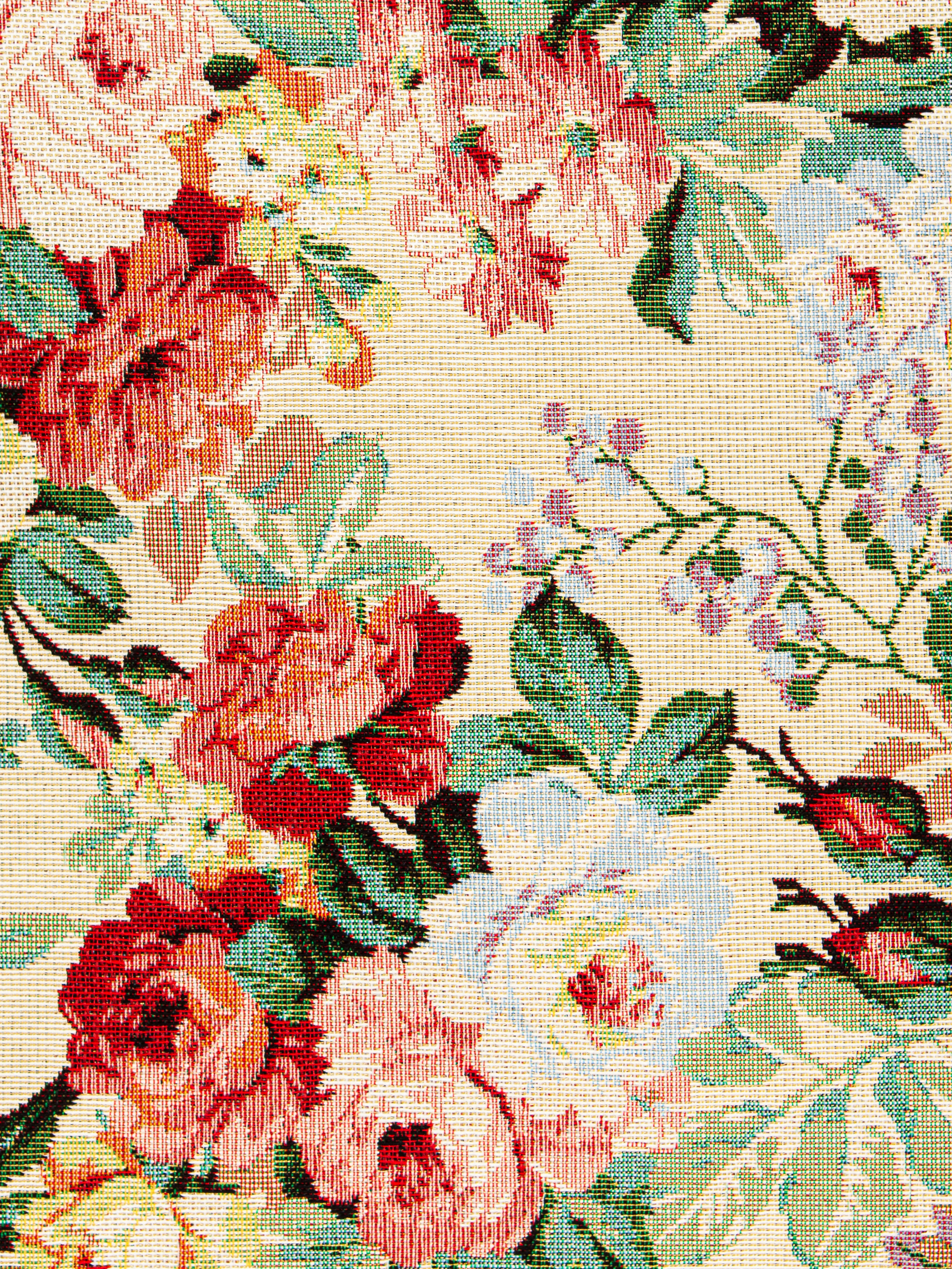 Рисунок создается переплетением нитей различных цветов и фактуры. Состав ткани: хлопок ( дающий фактуру и приятную тактильность ) и синтетические нити ( придающие износостойкость ). Плотность гобелена 410 г на кв.метр.