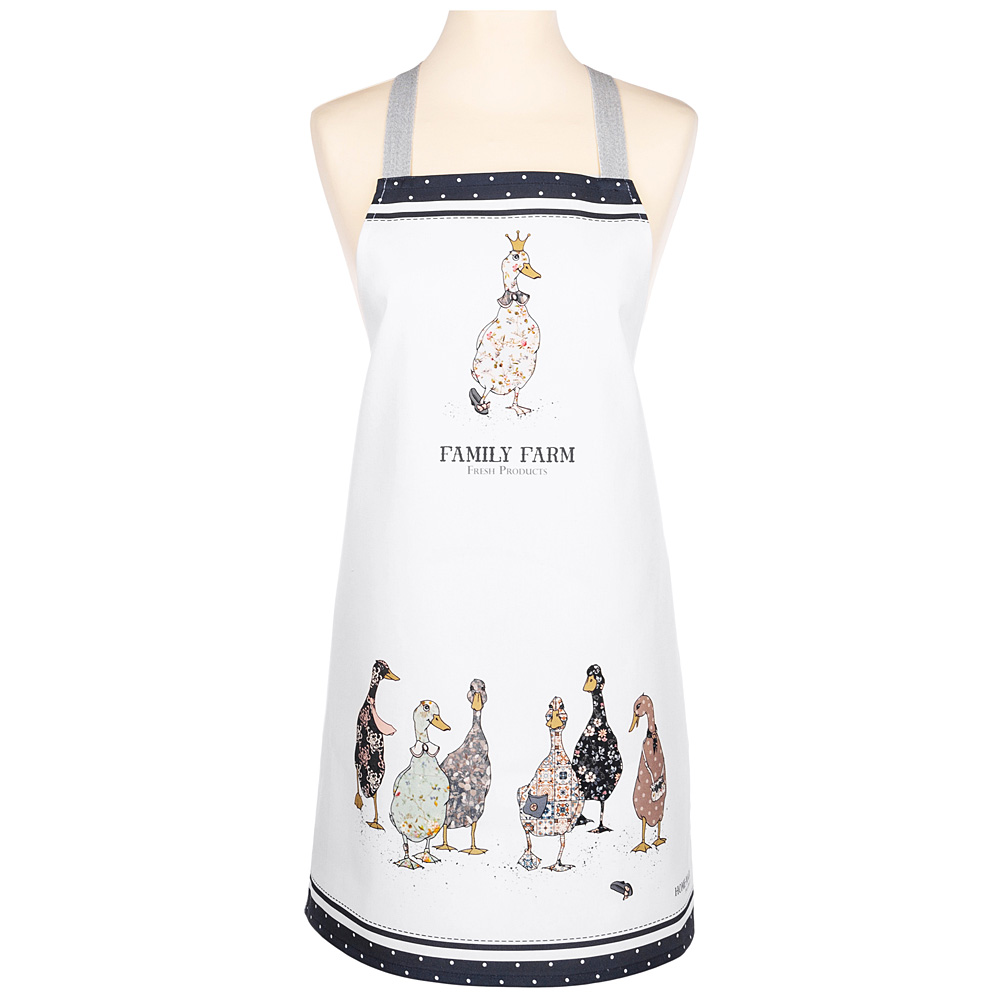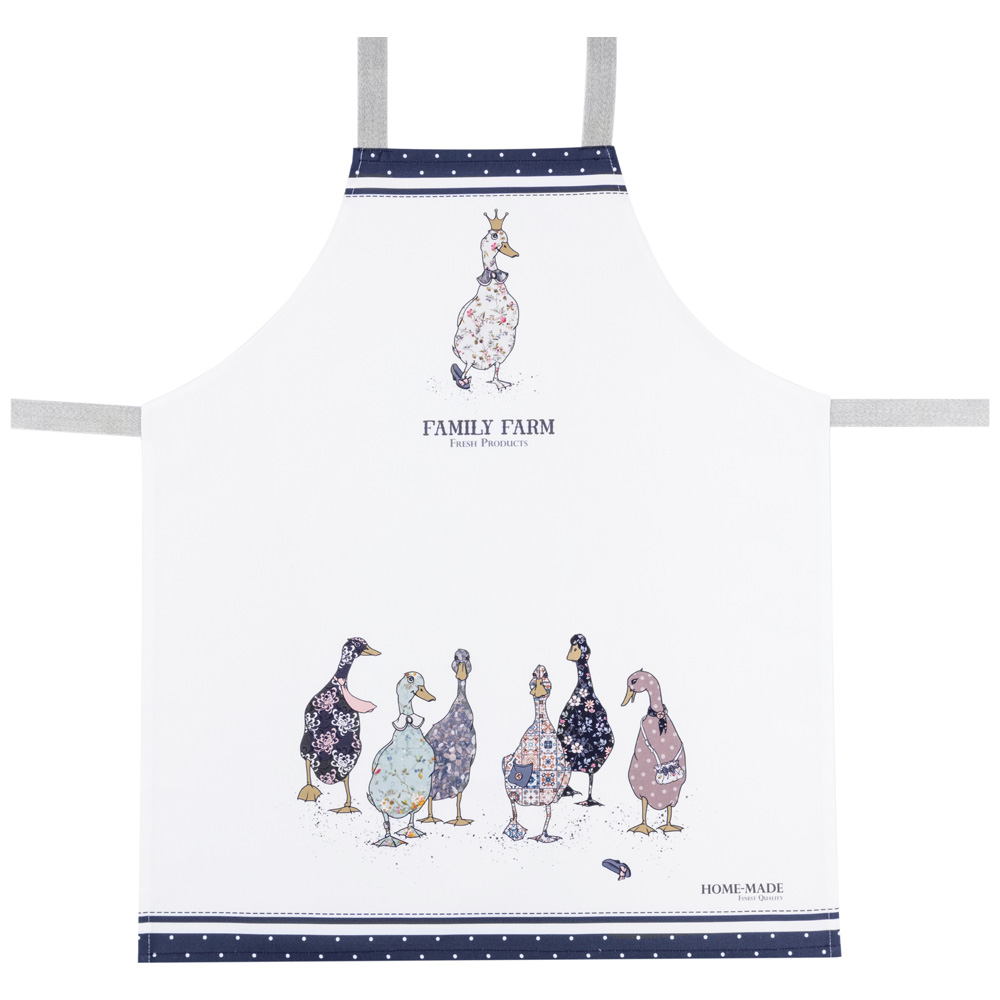 Фартук с принтом гусей выполнен в едином стиле с посудой из той же коллекции — вместе они создают гармоничную и уютную атмосферу на кухне. Цифровая печать сохраняет яркость рисунка даже после 100 стирок. Хлопковое полотно проходит каландрирование, что придаёт ткани плотность и лёгкий благородный блеск. Это не просто полезный текстиль, а стильный акцент в образе хозяйки.