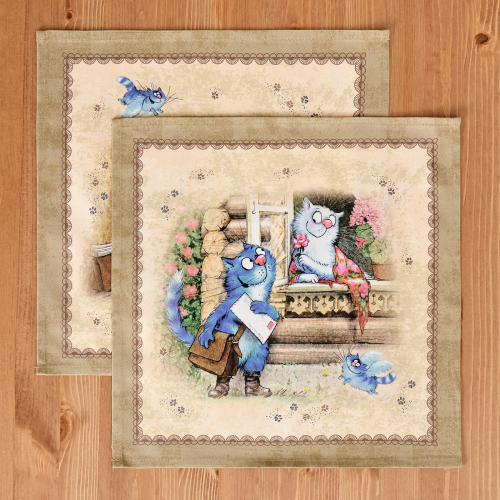 Набор тканевых салфеток от бренда Lefard из серии "Синие коты. Любовь моя" по мотивам иллюстраций Рины Зенюк. Этот комплект из двух квадратных салфеток станет отличным дополнением вашего интерьера. Они изготовлены из высококачественного 100% хлопка с саржевым переплетением Твил. Эта ткань не заламывается и не мнется, имеет высокую плотность, благодаря чему изделия из неё выглядят аккуратно и элегантно.