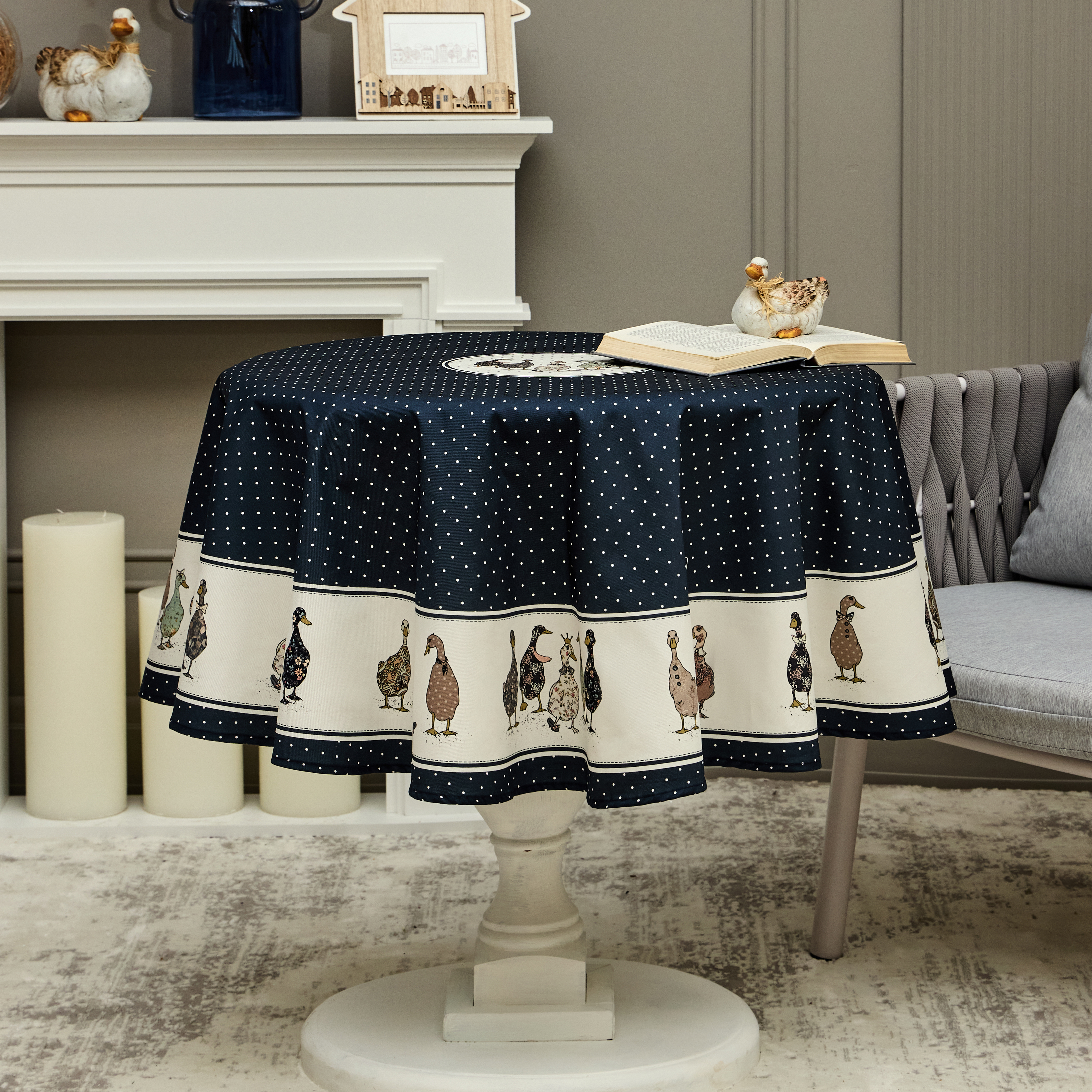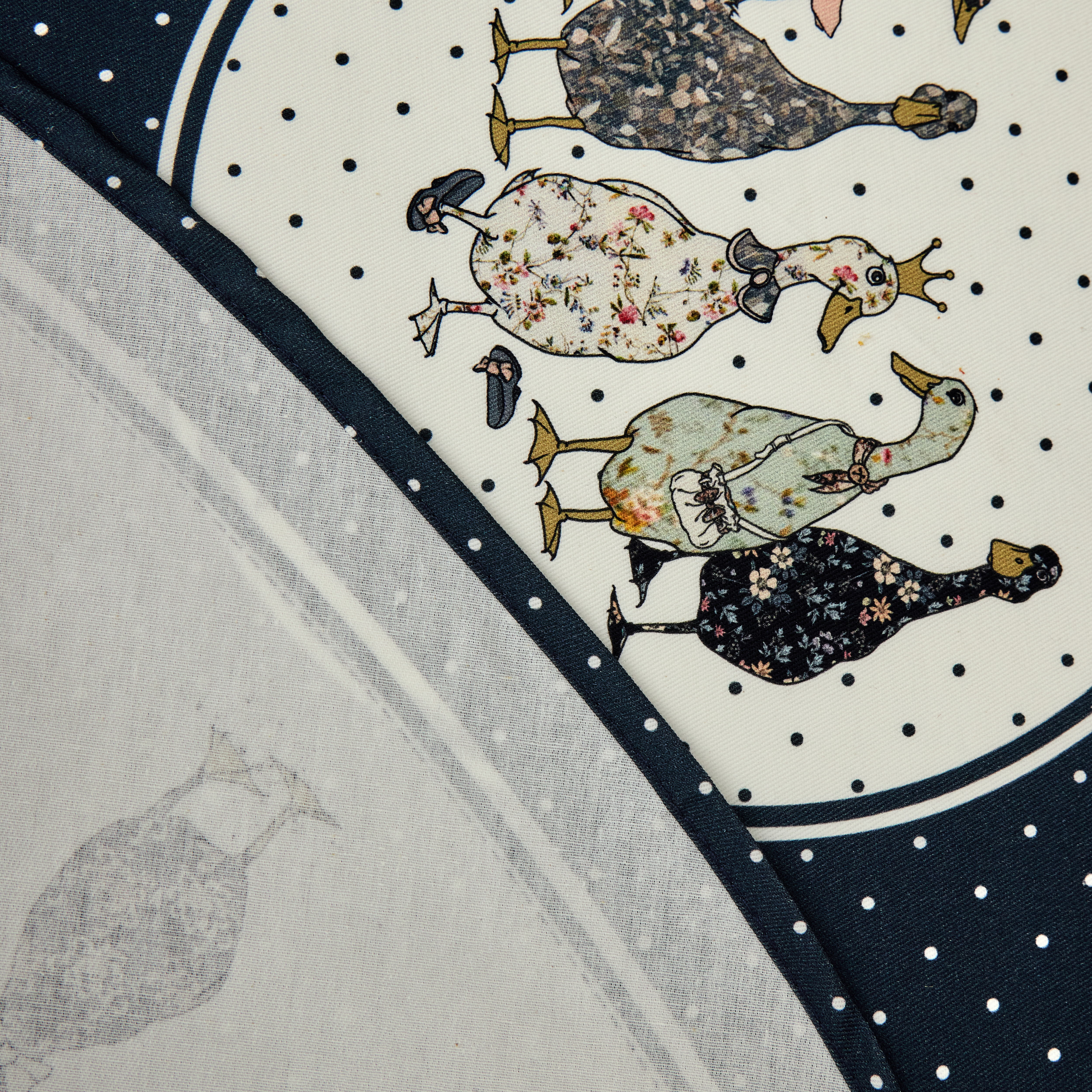 Сервировочная многоразовая скатерть с оригинальным рисунком гусей и изящным узором в горошек станет стильным украшением интерьера, создавая атмосферу уюта и тепла, а необычный принт добавит индивидуальности и очарования в сервировку стола; она идеально подходит для праздничного, обеденного или новогоднего стола, а также для пикника или чаепития в саду и на веранде, защищая мебель от влаги и загрязнений и превращая любой приём пищи в особенный момент.