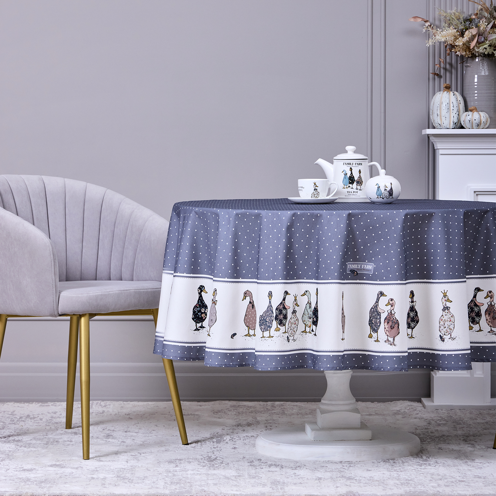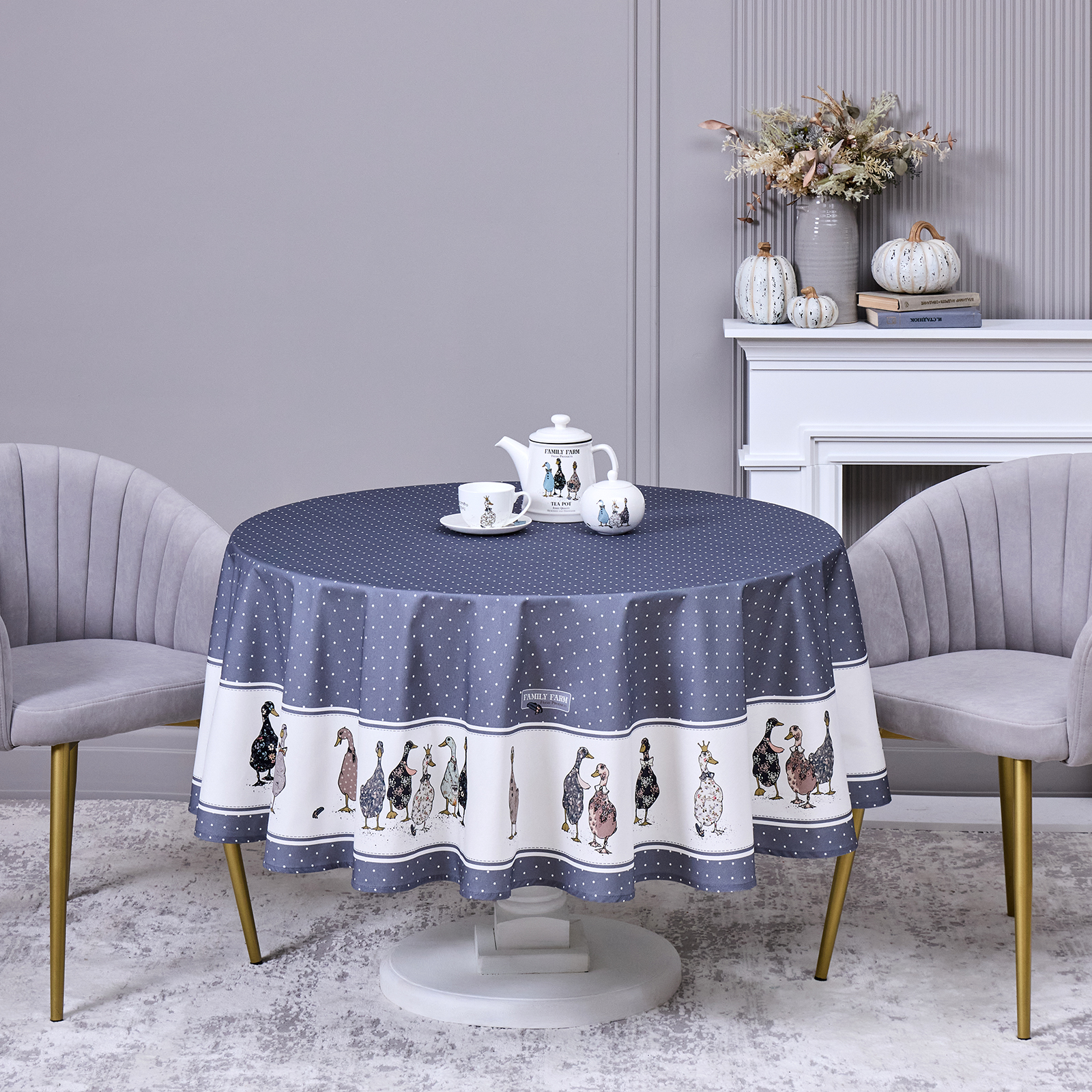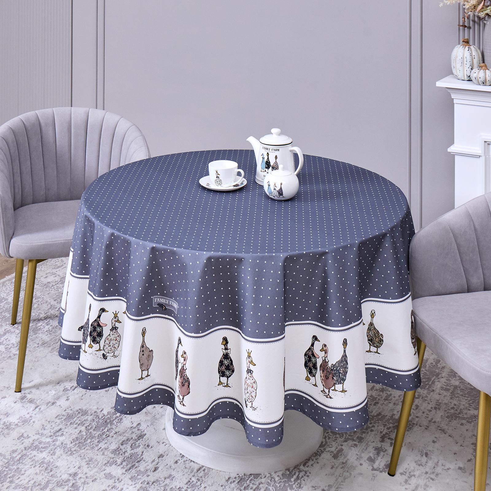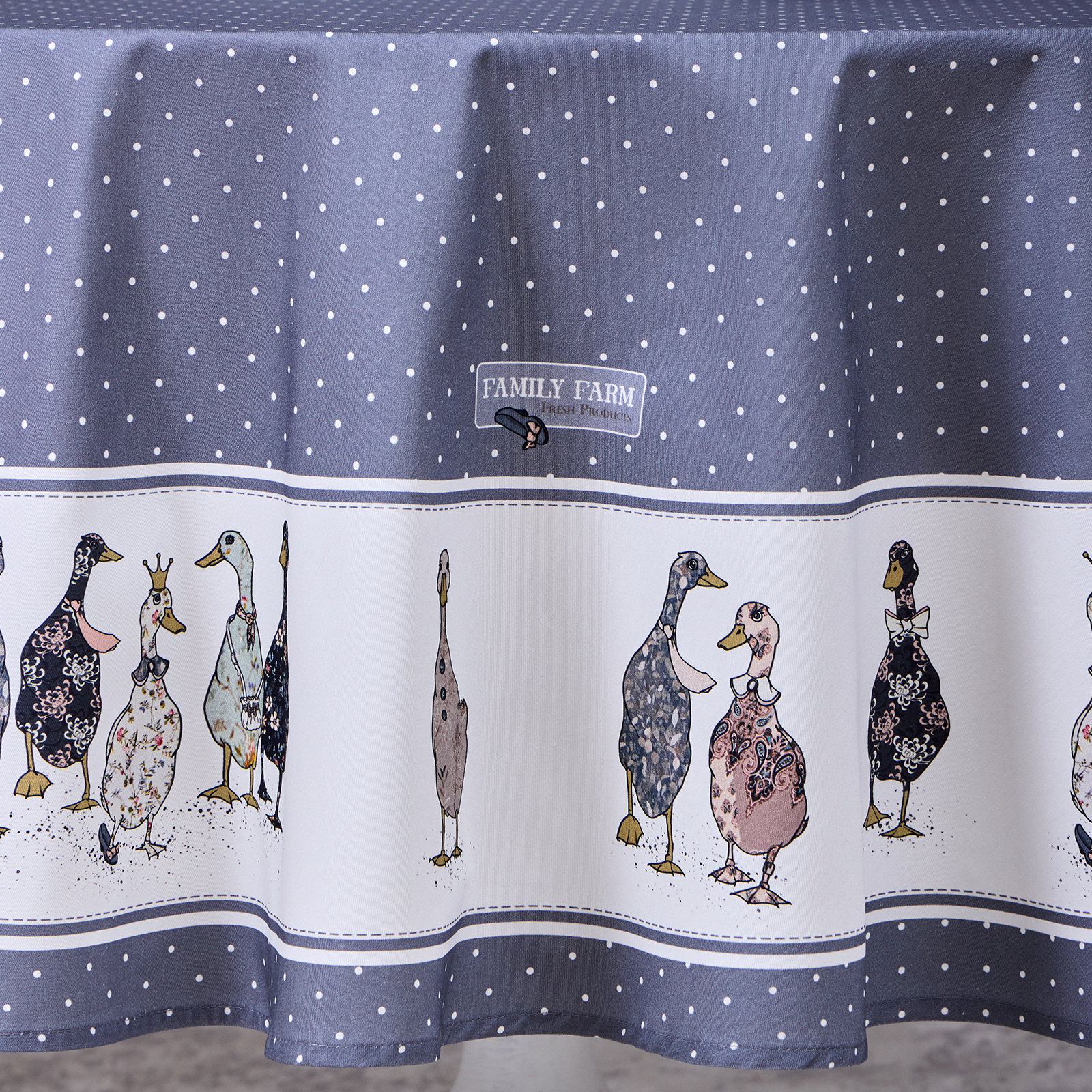 СКАТЕРТЬ КРУГЛАЯ "FAMILY FARM" 190 СМ , 100% ХЛОПОК,ТВИЛ, ПРОПИТКА, ГРАФИТ