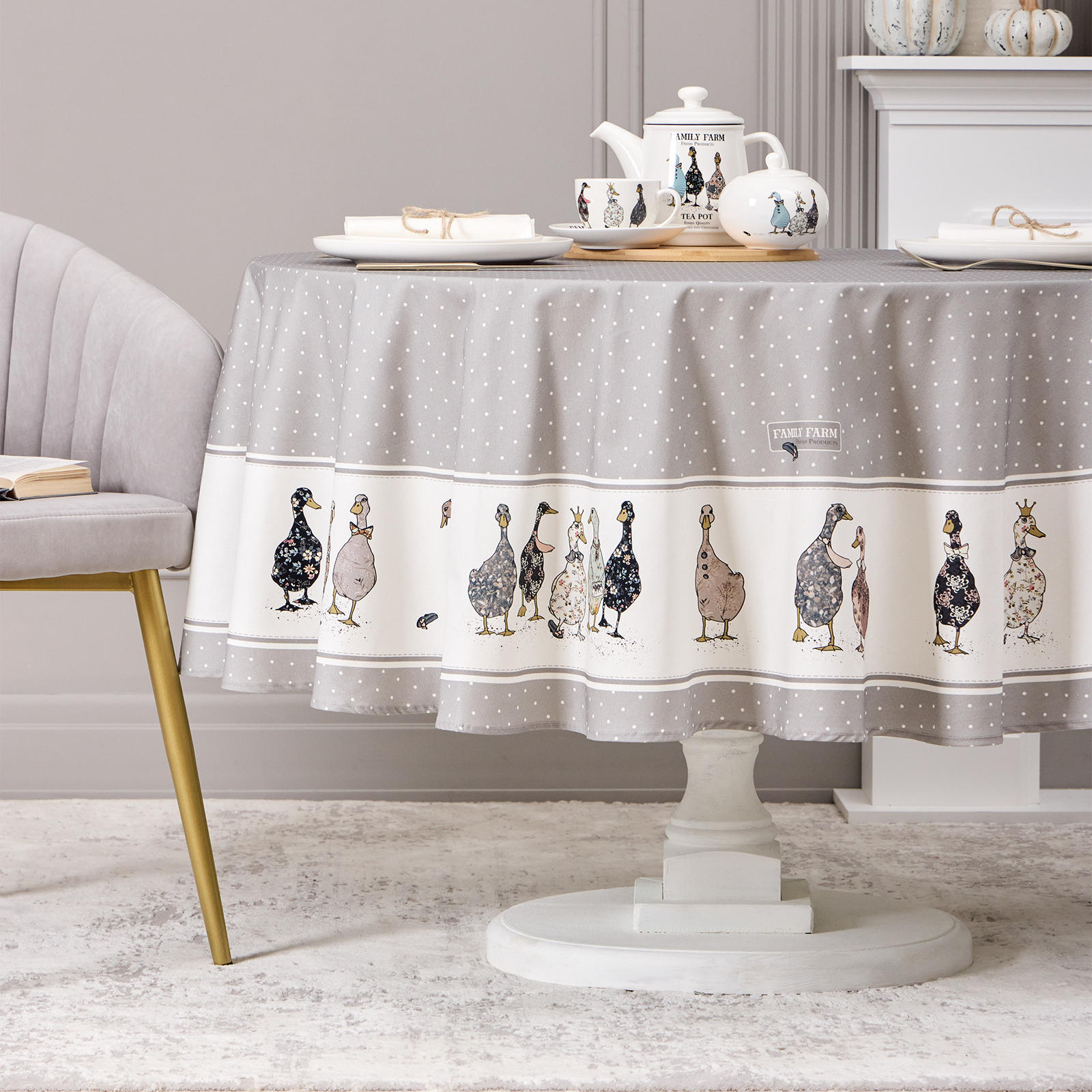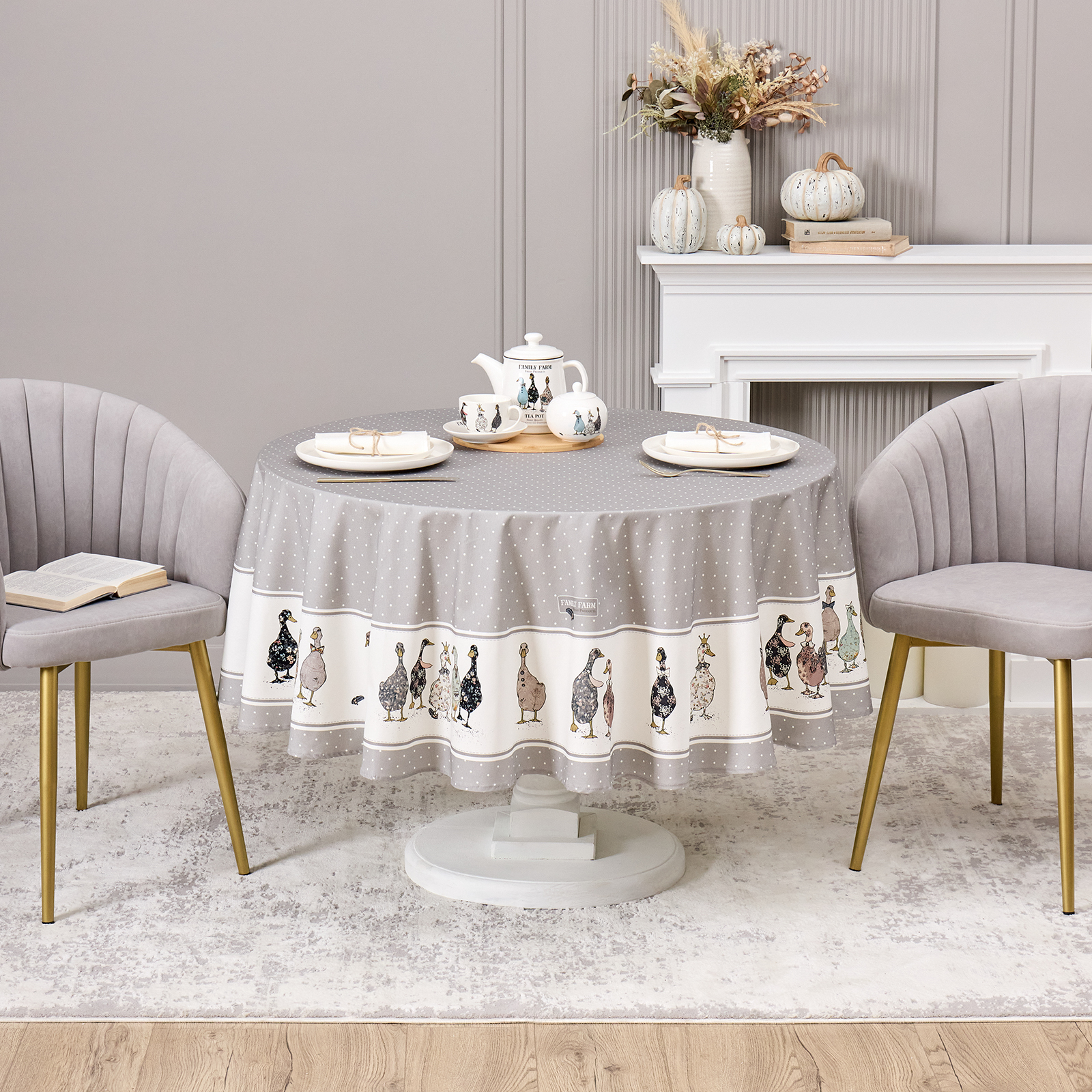 СКАТЕРТЬ КРУГЛАЯ "FAMILY FARM" 190 СМ , СЕРЫЙ ,100% ХЛОПОК , ТВИЛ, ПРОПИТКА