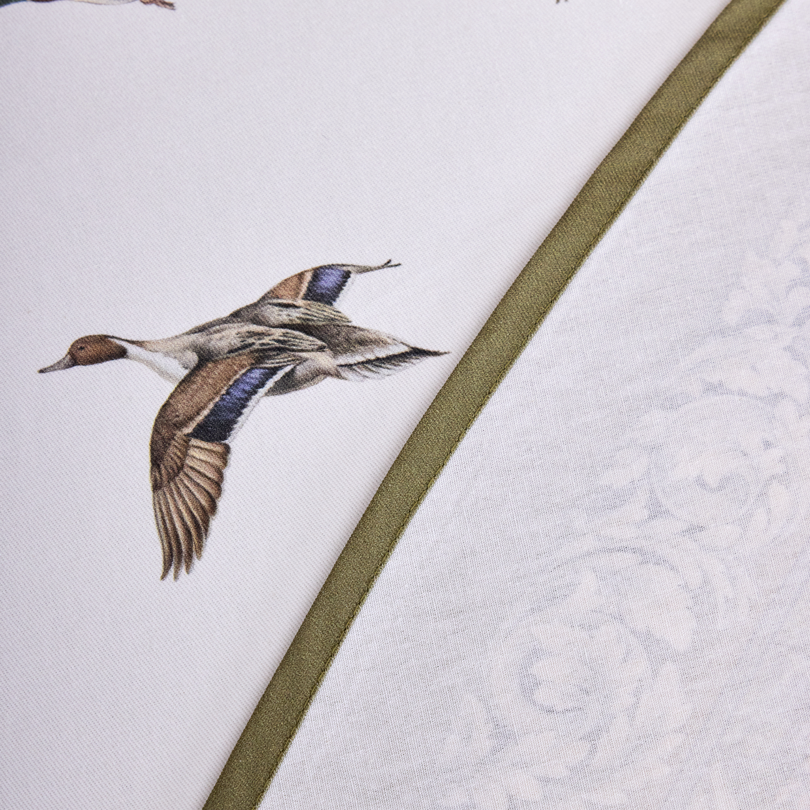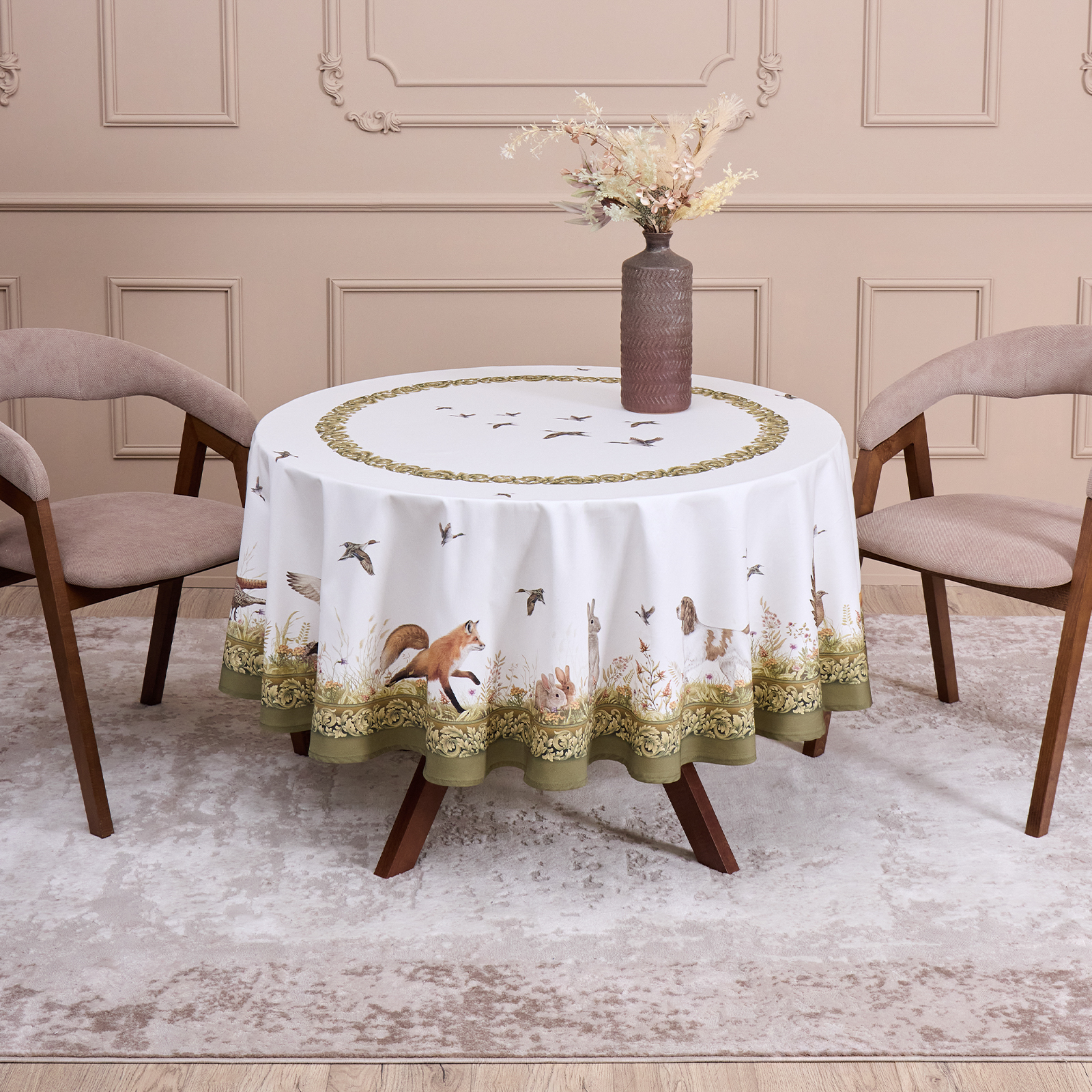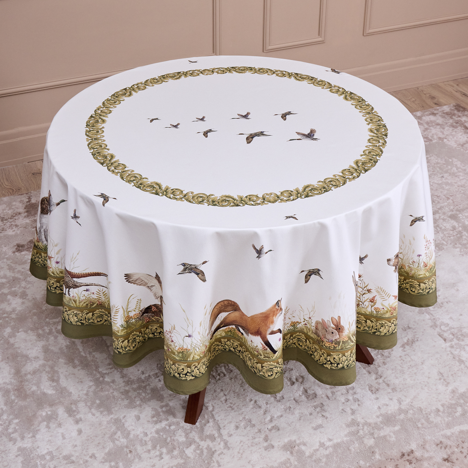 Скатерть оформлена принтом в охотничьей тематике: на светлом фоне изображены лесные животные — лиса, утки, фазаны — в окружении трав и кустарников. Декоративная зелёная кайма подчёркивает сюжет и добавляет текстилю выразительности. Цвета нанесены методом цифровой печати, что гарантирует стойкость красок и детализацию даже после многократных стирок.