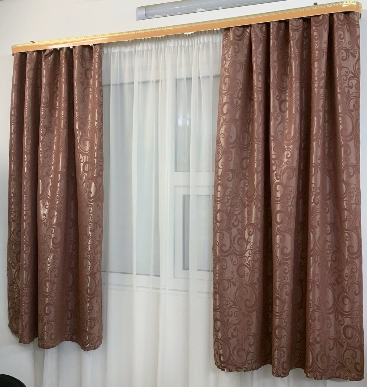 Классический, стильный комплект для кухни. Плотная, портьерная ткань жаккард относительно легкая и мягкая, приятная на ощупь, красиво драпируется и хорошо держит форму.