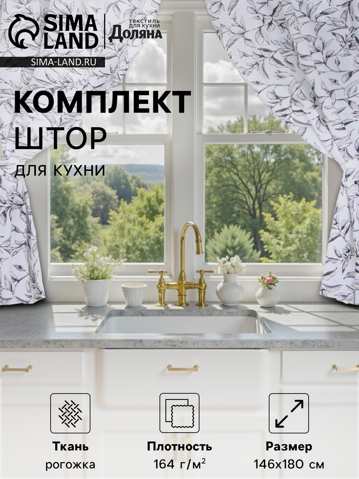 Шторы для кухни Доляна Plant leaves 146×180 см - 2 шт., подхваты - 2 шт., 100% хлопок, 164 г/м²
