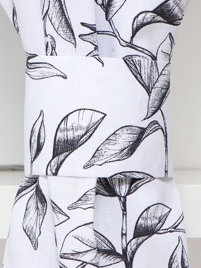 Белые шторы с графичным чёрным рисунком листьев — свежее и стильное решение для кухни. Они визуально освежают пространство, добавляют ему лёгкости и природной гармонии. Подхваты помогают контролировать свет в течение дня и подчёркивают элегантную драпировку. Это идеальный способ обновить интерьер без ремонта, получив готовый, продуманный образ окна.