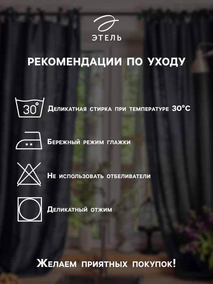 Шторы изготовлены из смесовой ткани, которая меньше мнётся по сравнению со стопроцентным льном. Ухаживать за ними просто: деликатная стирка при 30 °C, бережный отжим и глажка. Такая забота надолго сохранит форму и цвет полотен. Готовый комплект поставляется в удобной упаковке с крючком, готовый к использованию.