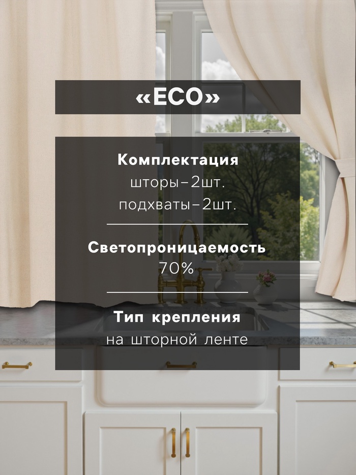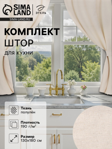 Шторы для кухни Этель ECO, цвет молочный, 130±6×180 см - 2 шт., подхваты - 2 шт.