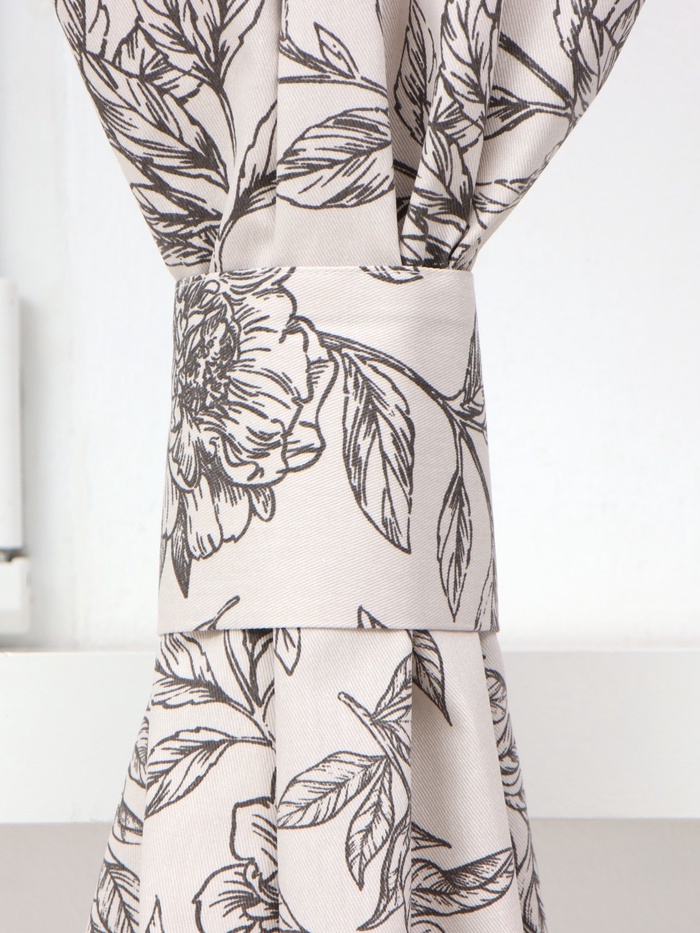 Этот комплект из двух штор с подхватами создан для кухни. Он наполняет комнату мягким рассеянным светом, сохраняя ощущение уюта и приватности. Изящный бежевый фон с чёрным растительным орнаментом добавляет интерьеру графичности и стиля, не перегружая пространство.