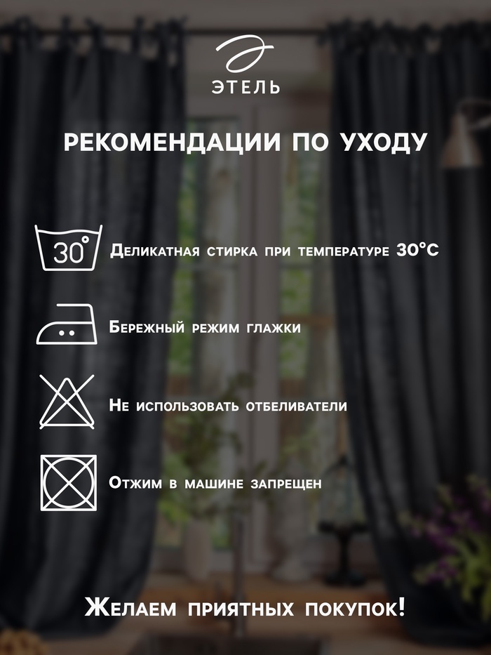 Рекомендации по уходу: Бережный режим глажки, Не отбеливать, Деликатная стирка при 30 °С, Отжим в машине запрещён