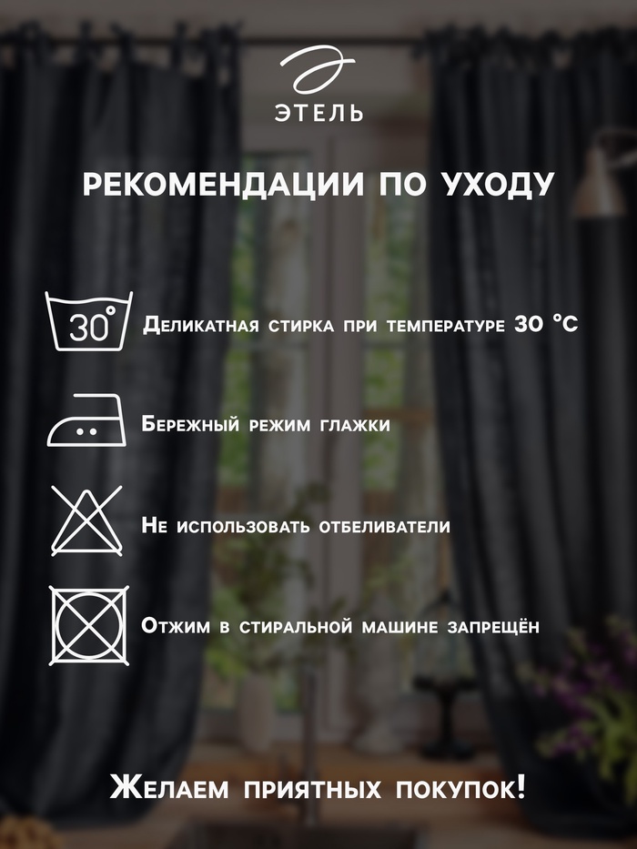 Шторы из плотного хлопка долговечны и приятны на ощупь. Они не выгорают и хорошо держат форму. Ухаживать за ними просто: деликатная стирка при 30 °C без отбеливания и машинного отжима. После лёгкого глажения на бережном режиме они снова выглядят идеально.