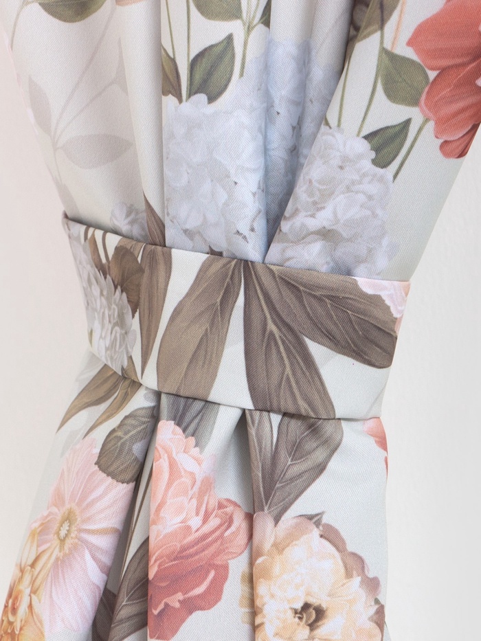 Набор из двух штор с подхватами для кухни создаёт лёгкую, наполненную светом атмосферу. Полупрозрачный бежево-розовый габардин с цветочным рисунком мягко рассеивает дневной свет, сохраняя ощущение простора. Комплект подходит для любого сезона, а нежная тематика цветущего сада делает его гармоничным дополнением к праздничному декору.