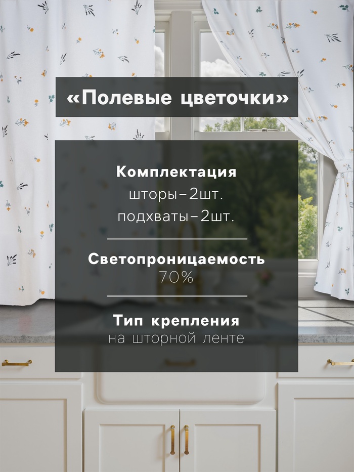 Набор из двух кухонных штор с подхватами создаёт уютную и свежую атмосферу. Белое полотно с нежным цветочным рисунком мягко рассеивает солнечный свет, наполняя комнату спокойным, ровным освещением. Комплект подойдёт для оформления окна на кухне или в столовой.