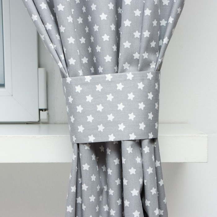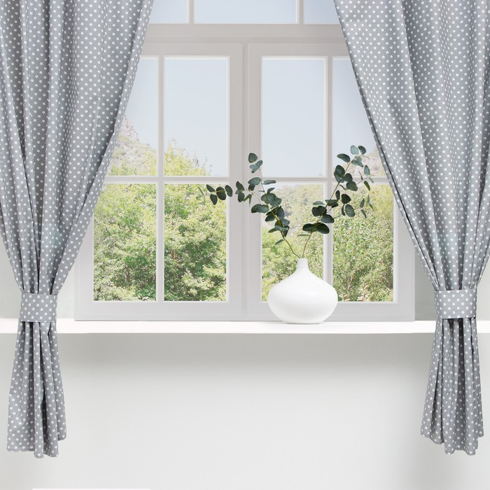 Серые кухонные шторы с рисунком звёзд создают на окне мягкое, рассеянное освещение. Комплект из двух фигурных портьер и подхватов сразу готов к размещению. Сатиновое полотно с гладкой фактурой и шторной лентой легко драпируется, сохраняя аккуратные складки.