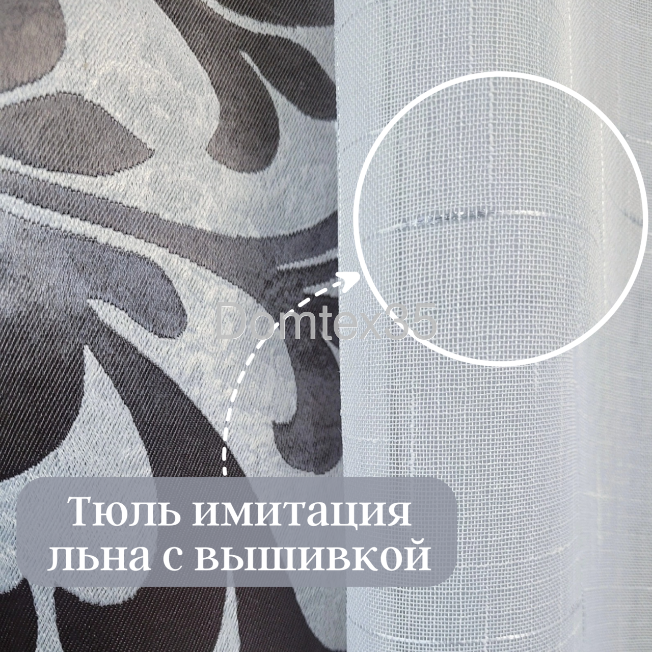 Тюль (имитация льна с вышивкой) 2,6*1,6м разделена на две половины, скрепленные между собой шторной лентой.