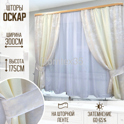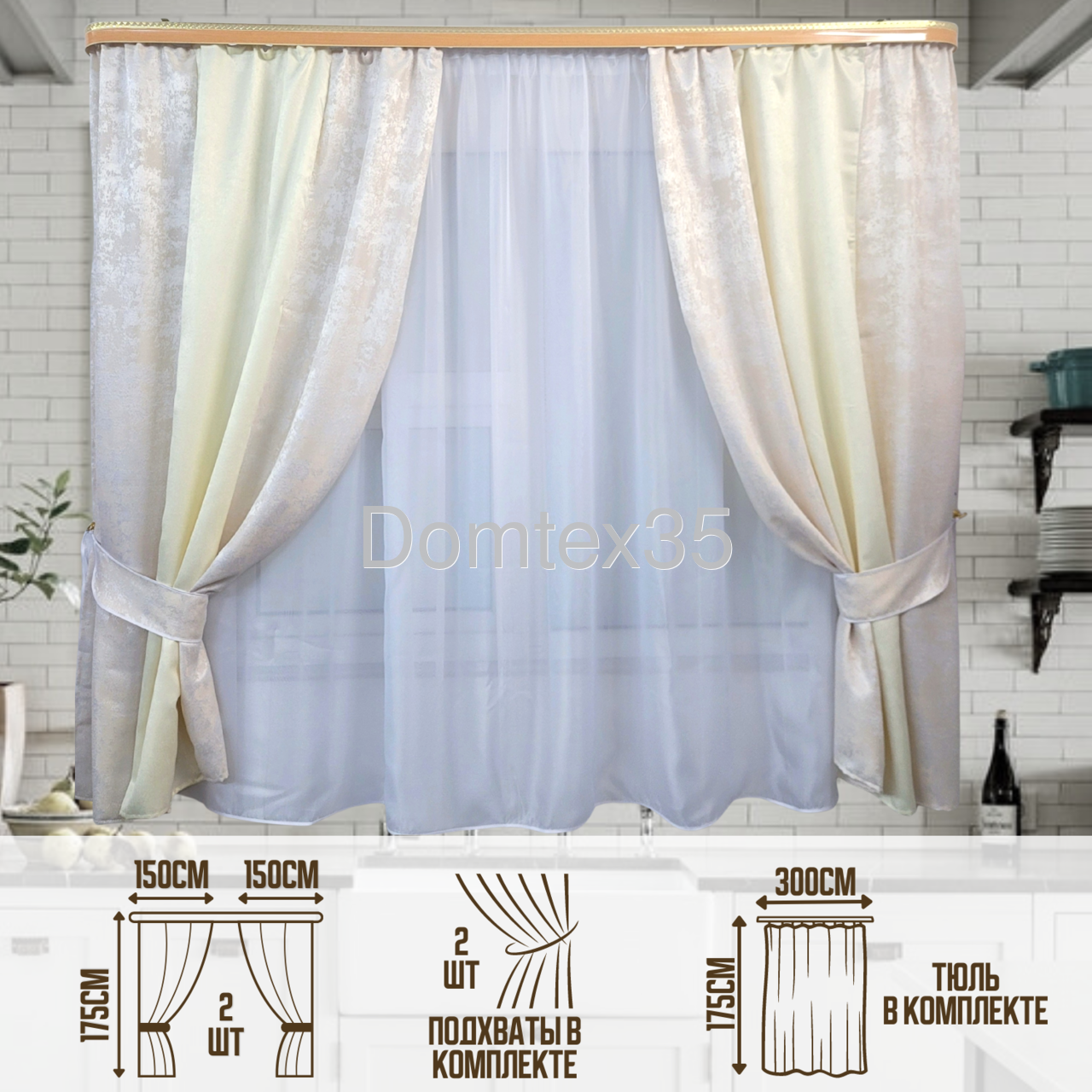 Классический, стильный комплект для кухни. Плотная, портьерная ткань жаккард относительно легкая и мягкая, приятная на ощупь, красиво драпируется и хорошо держит форму.