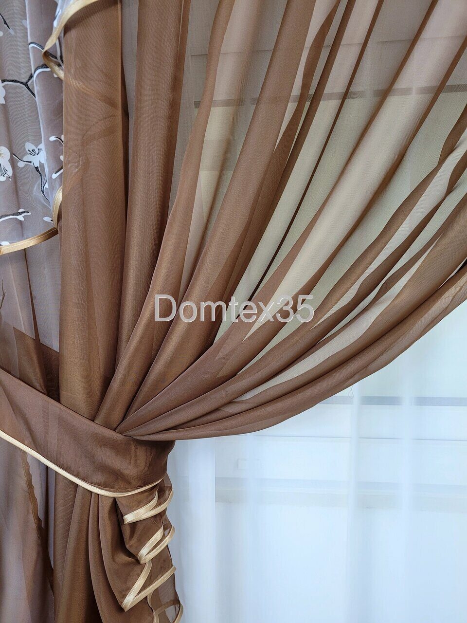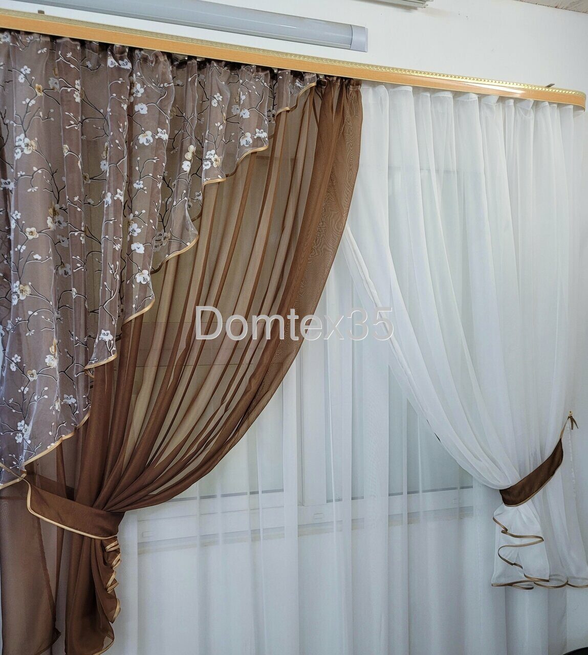 Модель отличается романтичным принтом, легким и простым фасоном. Состоит из двух однотонных вуалевых штор, одна из которых украшена органзой с цветочным орнаментом.