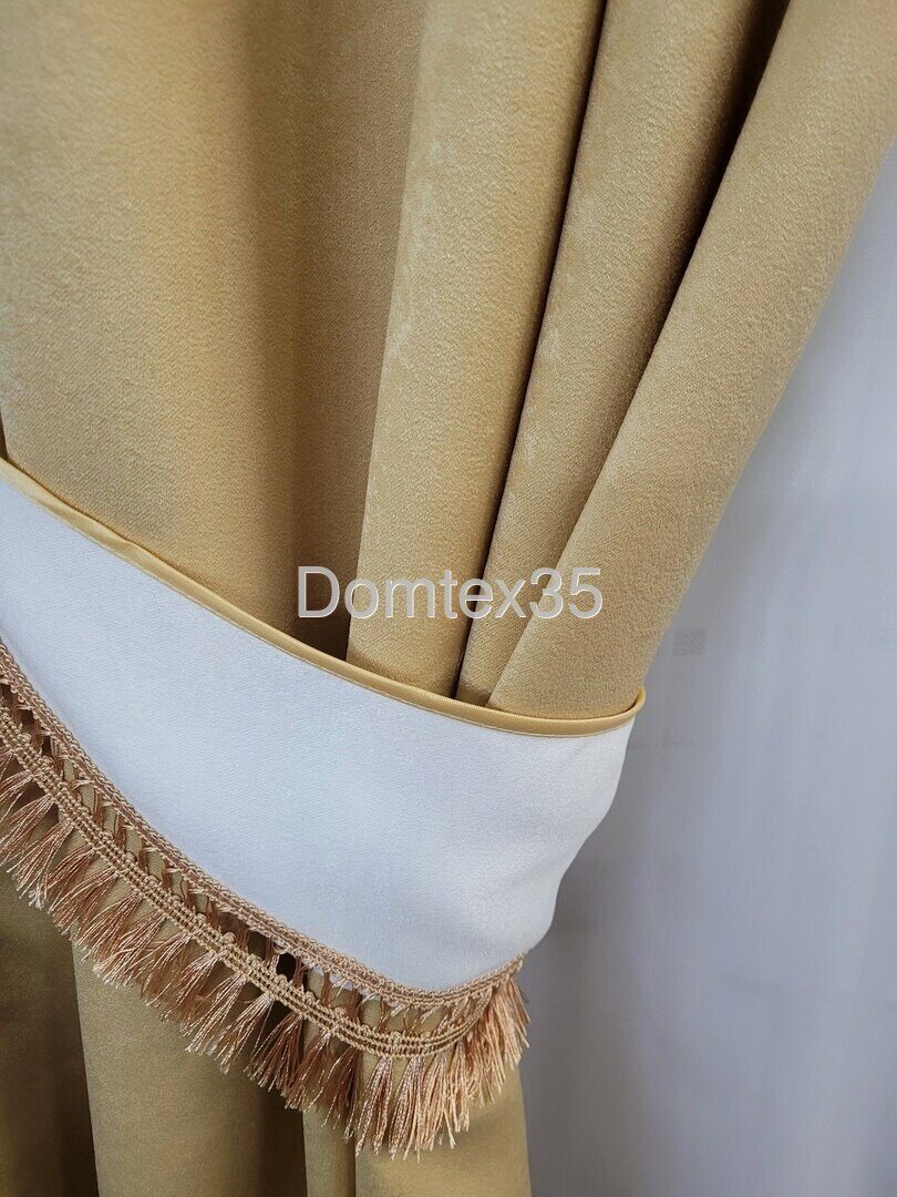 Модель выполнена из мягкого однотонного софта. Ламбрекен и прихваты оформлены бахрамой по нижнему краю. Вуалевая тюль обшита по краям атласной лентой.