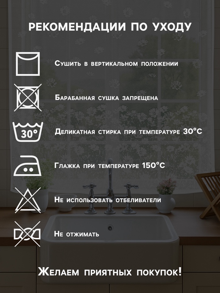 Рекомендации по уходу: Глажка при 150 °С, Отжим в машине запрещён, Сушка в подвешенном состоянии, Деликатная стирка при 30 °С, Не отбеливать, Барабанная сушка запрещена