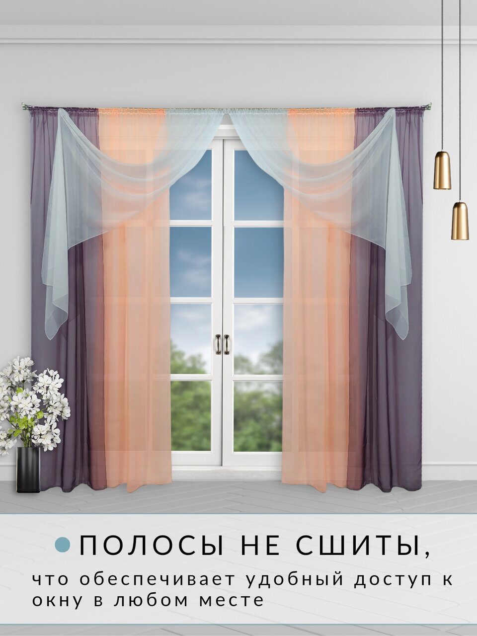 Модель состоит из двух штор, каждая из которых разделена на три полосы. Полосы между собой не сшиты по длине, а закреплены только сверху шторной лентой, таким образом получается очень удобный доступ к окну.