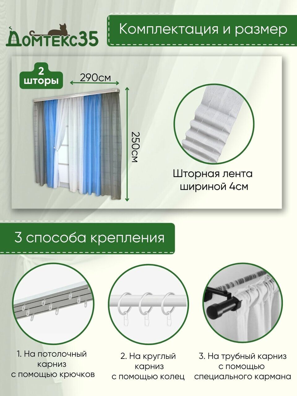 Тип крепления - шторная лента, стягивая которую, создаются качественные и аккуратные складки. Подойдет для любого вида карниза с крючками и зажимами.