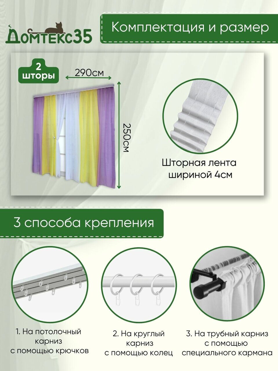 Тип крепления - шторная лента, стягивая которую, создаются качественные и аккуратные складки. Подойдет для любого вида карниза с крючками и зажимами.