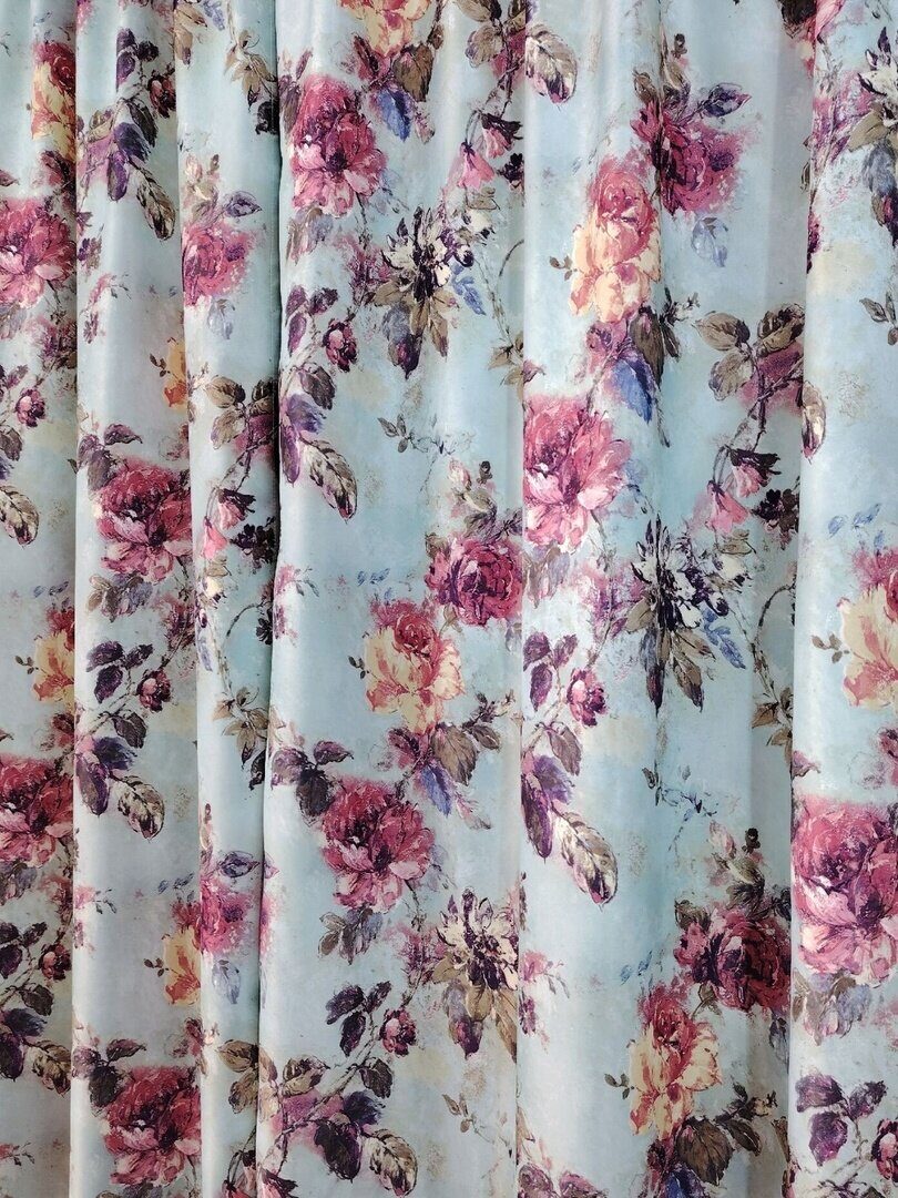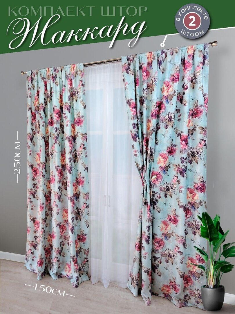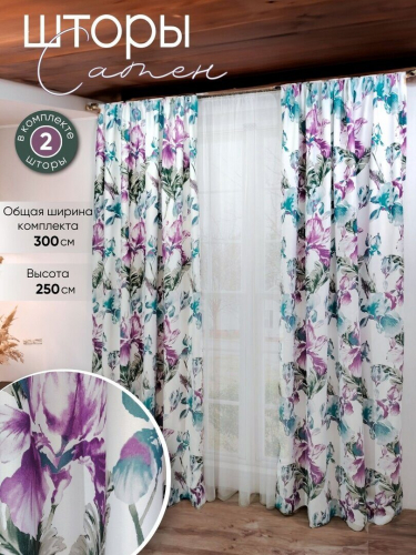 Комплект состоит из двух штор, которые изготовлены из жаккардовой ткани средней плотности с бархатистой лицевой стороной на которую нанесен печатный рисунок.