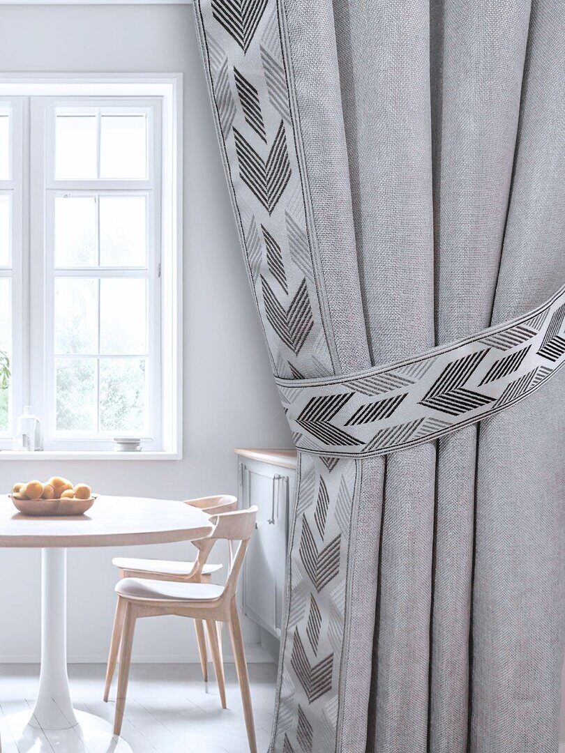 Шторы и подхваты декорированы жаккардовой лентой, которая имеет объемный плетеный узор, напоминающий вышивку.