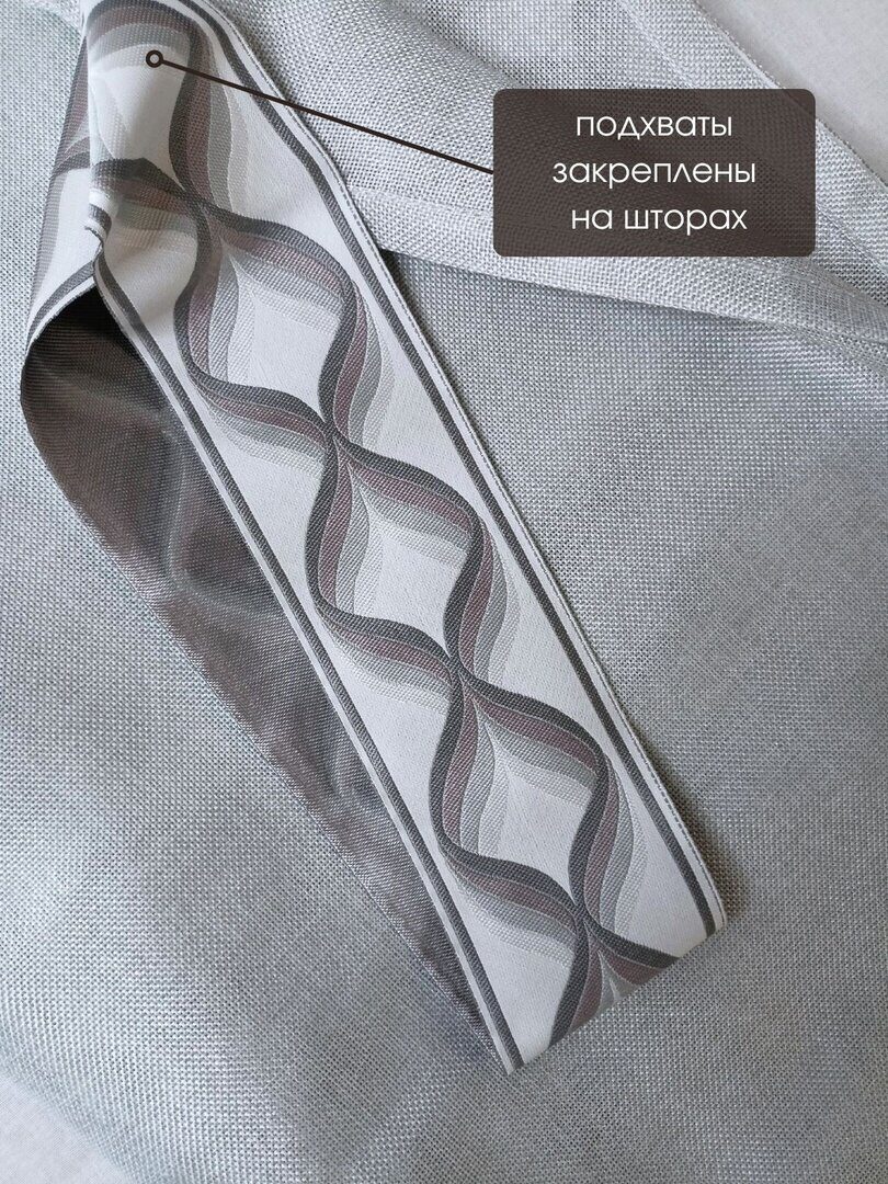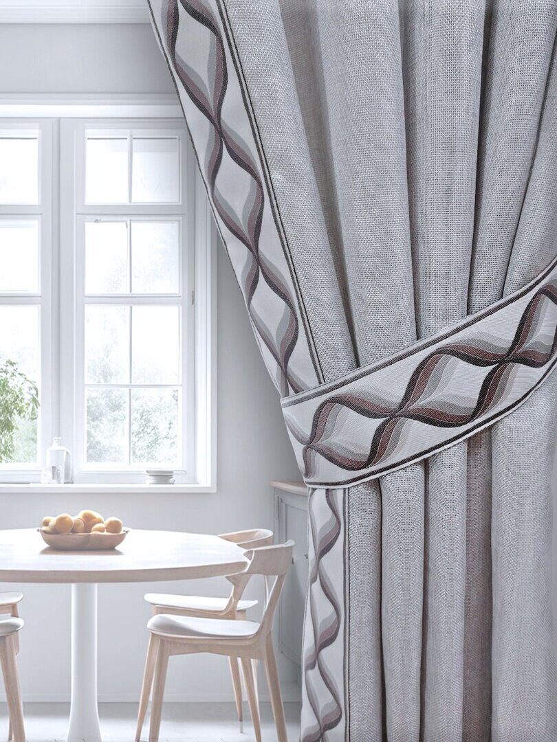 Шторы и подхваты декорированы жаккардовой лентой, которая имеет объемный плетеный узор, напоминающий вышивку.