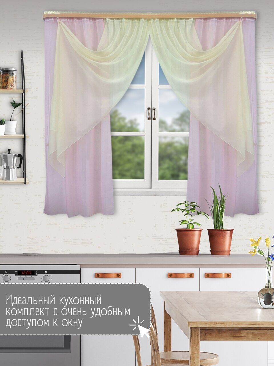 Кухонный комплект из мягкой однотонной вуали, скомбинированный из трех цветов.