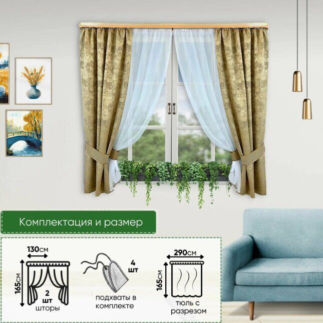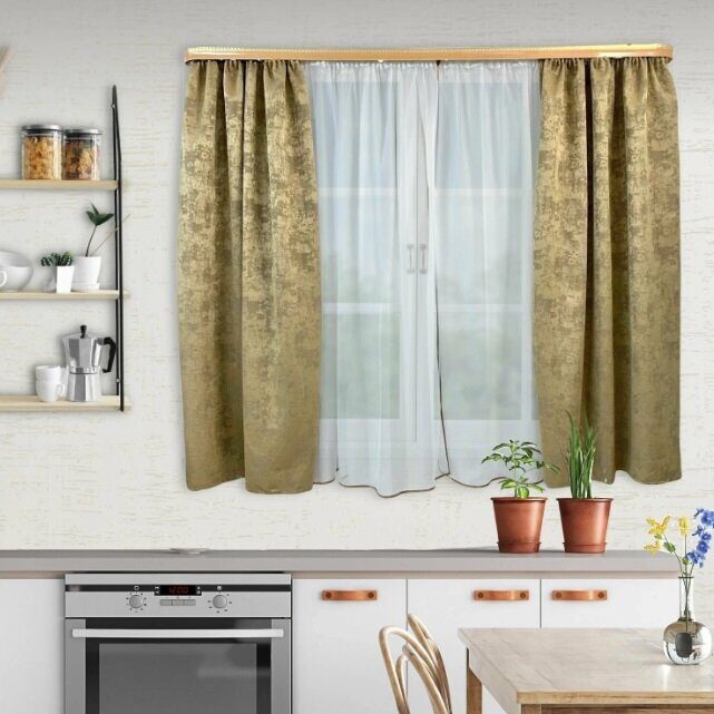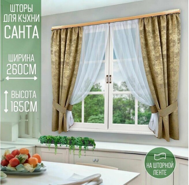 Классический, стильный комплект для кухни. Плотная, портьерная ткань жаккард относительно легкая и мягкая, приятная на ощупь, красиво драпируется и хорошо держит форму.