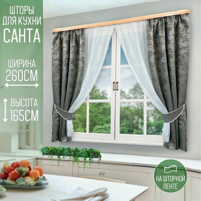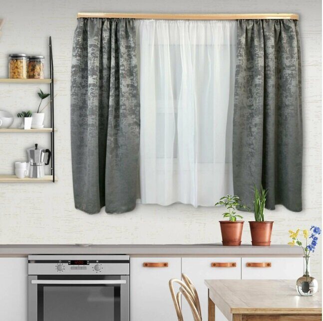 Классический, стильный комплект для кухни. Плотная, портьерная ткань жаккард относительно легкая и мягкая, приятная на ощупь, красиво драпируется и хорошо держит форму.