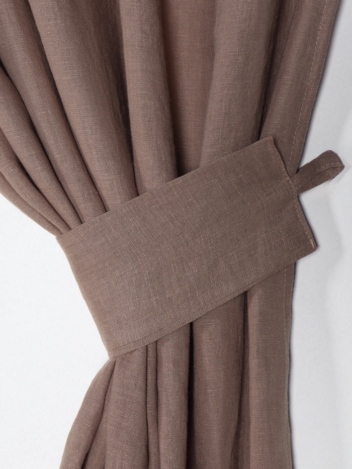 Этот комплект из двух льняных штор с подхватами создаёт на кухне атмосферу природного тепла и уюта. Плотная ткань естественного коричневого оттенка мягко рассеивает свет, сохраняя ощущение простора и защищая от яркого солнца. Шторы готовы к использованию — остаётся только закрепить их на карнизе с помощью шторной ленты.