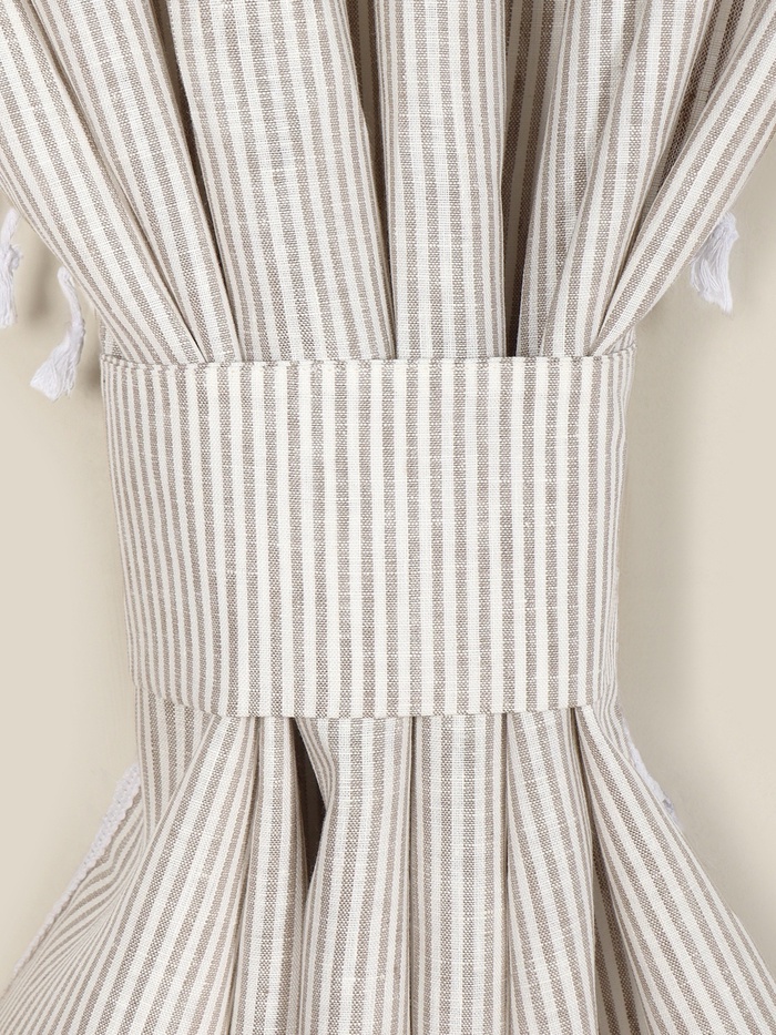 Этот комплект из двух полосатых штор для кухни создаёт ощущение свежести и порядка. Натуральный лён мягко рассеивает солнечный свет, наполняя комнату уютным, тёплым сиянием. Вместе с декоративными подхватами вы легко сможете менять образ окна — от строгого собранного вида до лёгких воздушных складок.