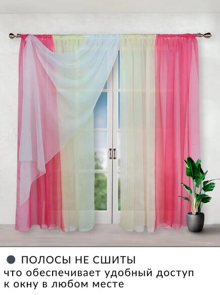 Модель состоит из одной тюли, которая разделена на пять полос. Полосы между собой не сшиты по длине, а закреплены только сверху шторной лентой, таким образом получается очень удобный доступ к окну.