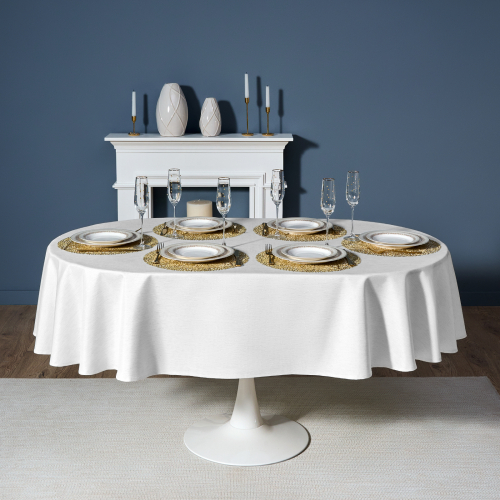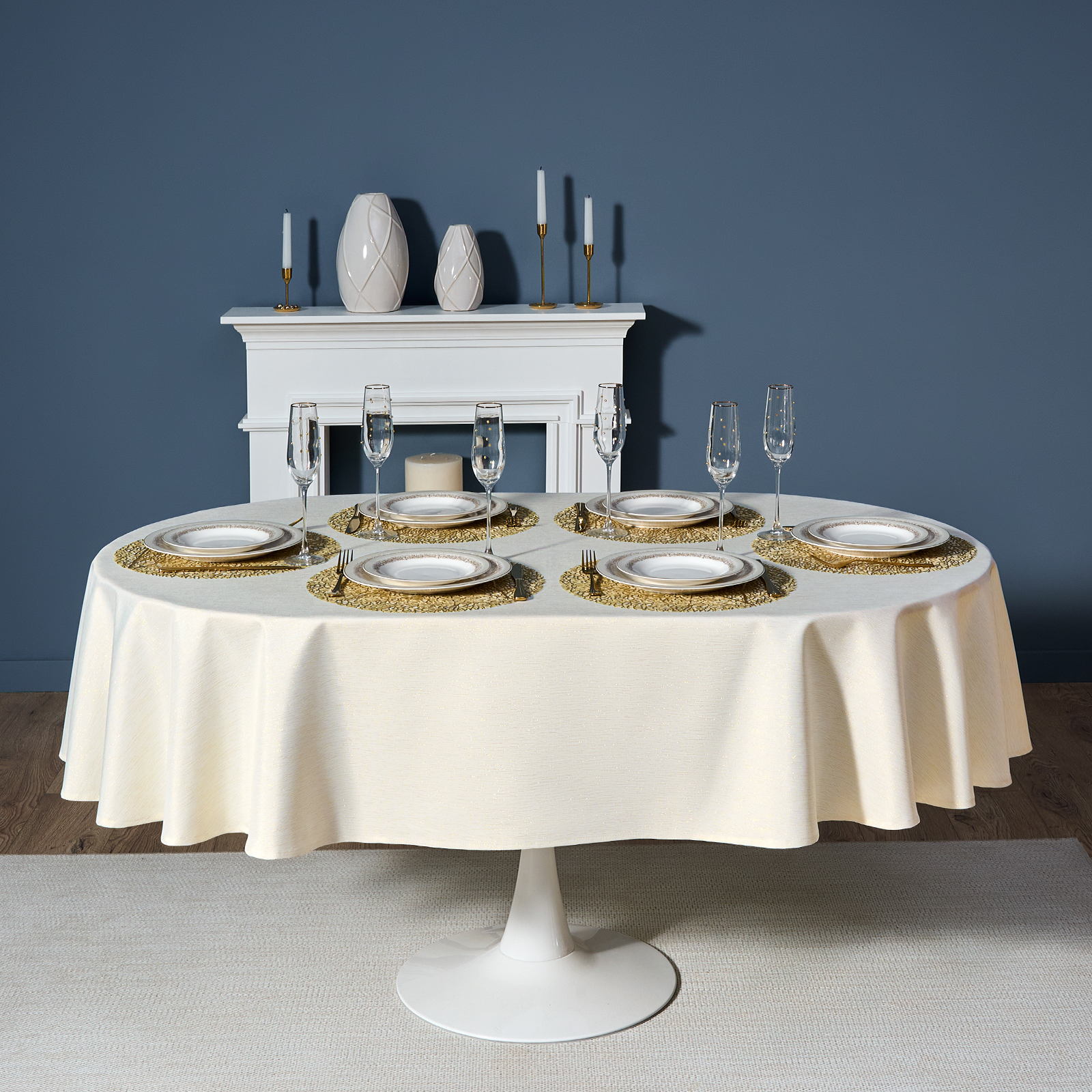 Благородный золотой оттенок ткани наполняет пространство теплом и атмосферой праздника. Лёгкий блеск люрекса красиво играет при свете ламп и свечей, подчёркивая изысканность и роскошь интерьера кухни, гостиной или столовой. Однотонная текстура гармонично сочетается с посудой и аксессуарами Lefard, создавая завершённый образ праздничного декора для дома.