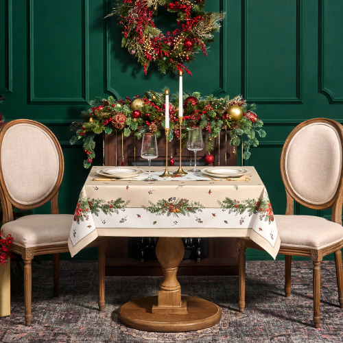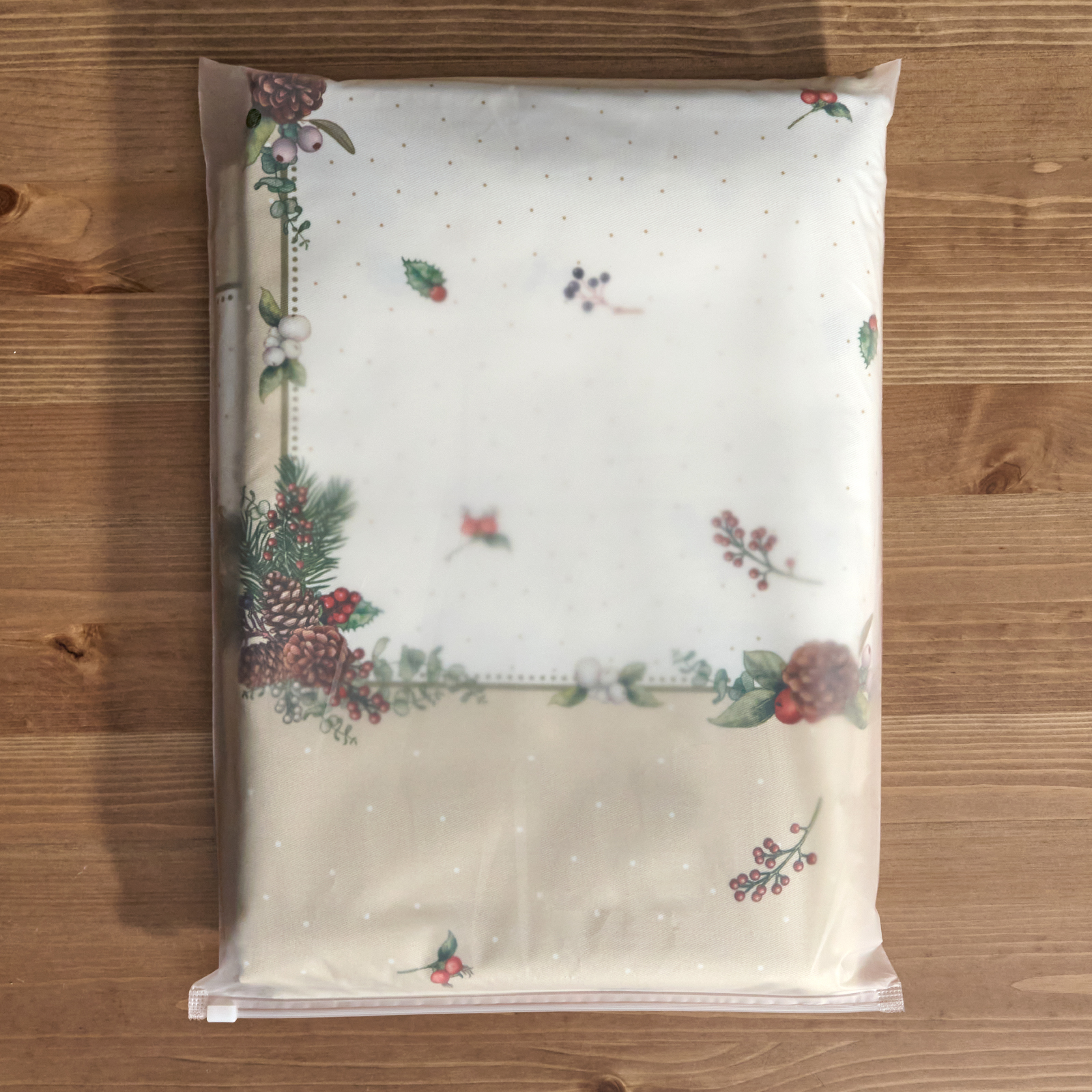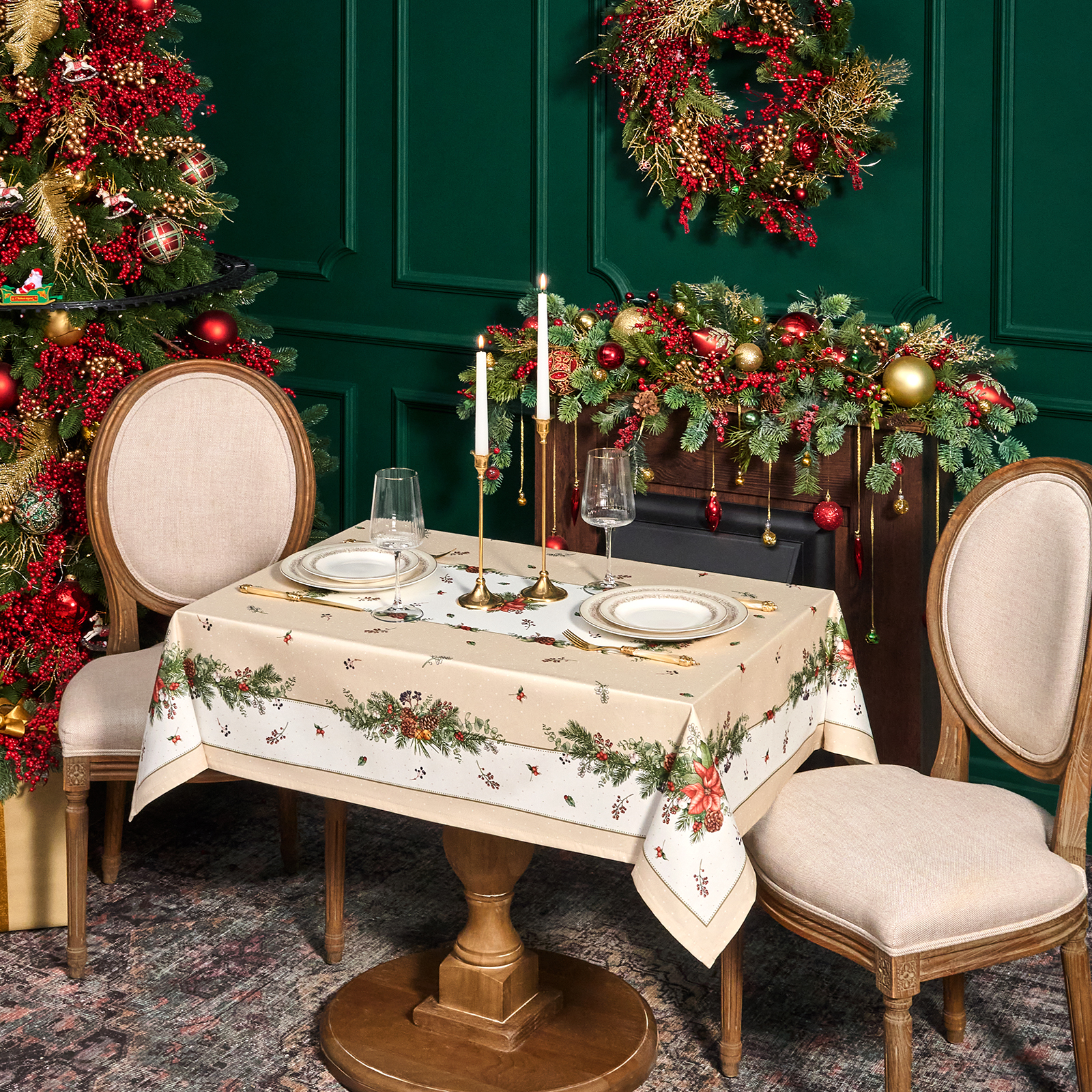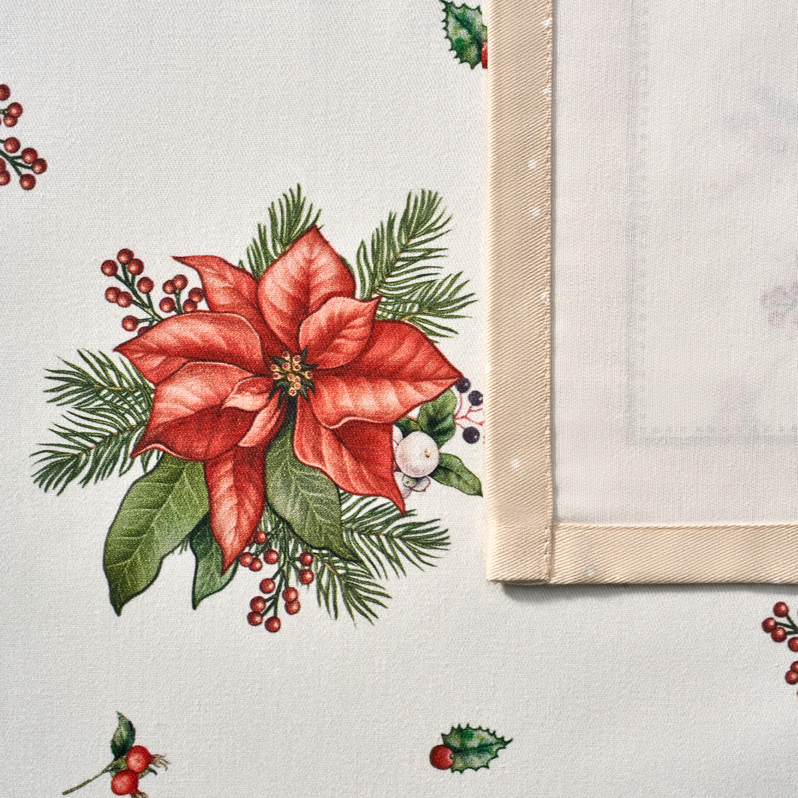 Праздничный принт в зимней тематике — еловые ветви, шишки, пуансеттии — выполнен по технологии цифровой печати, равномерно распределён по краям и в центре. Рисунок сохраняет насыщенность даже после многократных стирок. Такой декор придаёт столу завершённый и торжественный вид, легко комбинируется с посудой из серии Lefard или классическим сервизом.