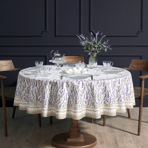 Лавандовый принт с цветочным орнаментом по нижнему краю создаёт атмосферу уюта и лёгкости в духе французского Прованса. Нежные оттенки и натуральная гамма делают скатерть универсальной для любого интерьера — от классического до кантри.