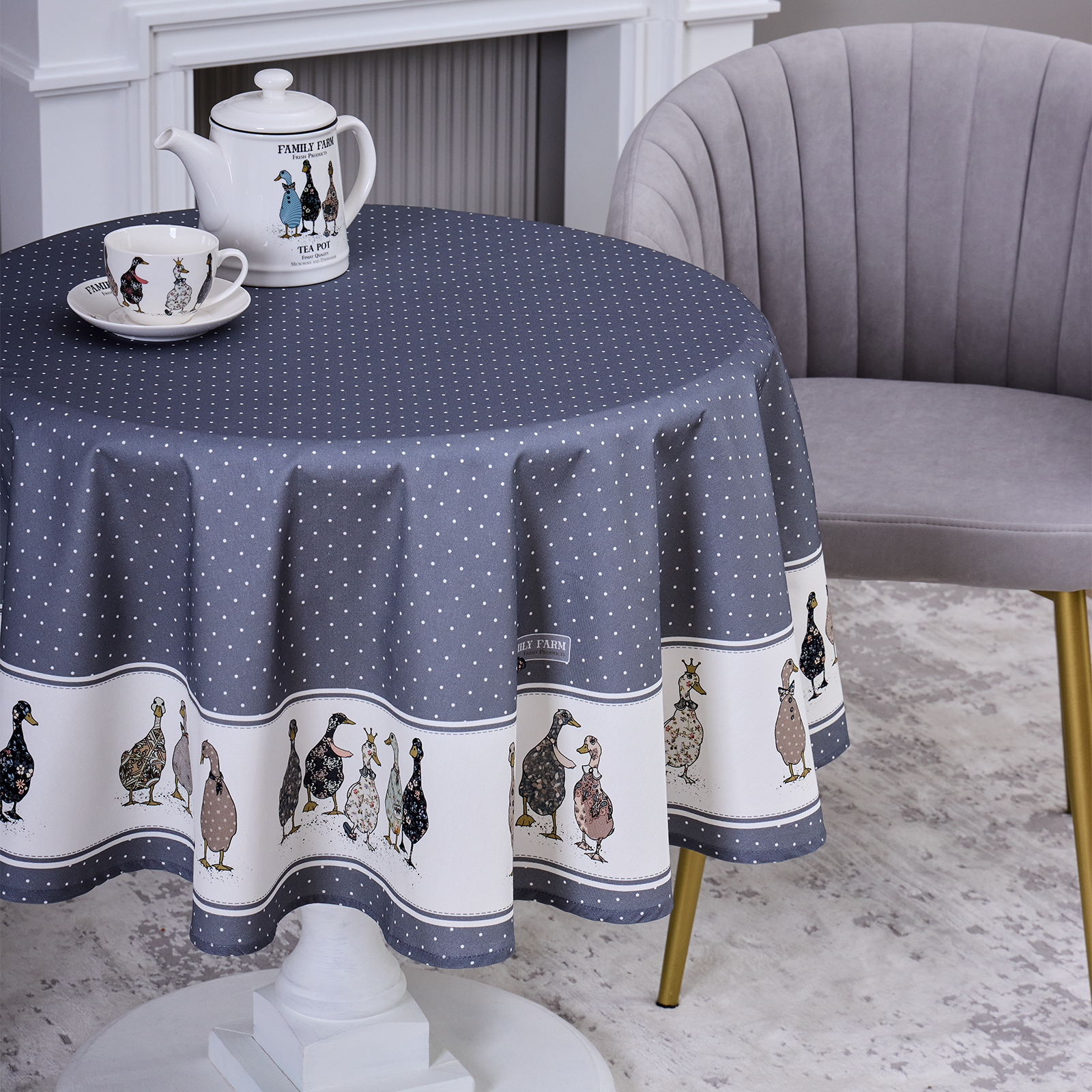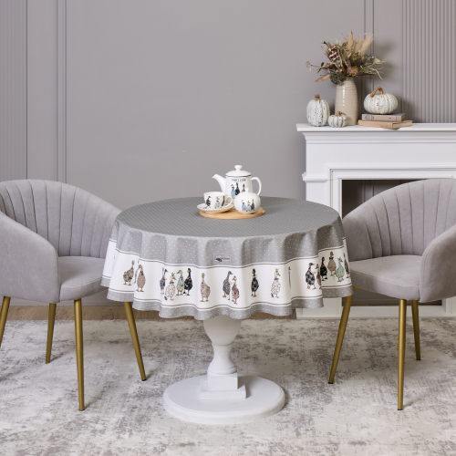 СКАТЕРТЬ КРУГЛАЯ "FAMILY FARM" 150 СМ ,100% ХЛОПОК, ГРАФИТ,ТВИЛ, ПРОПИТКА