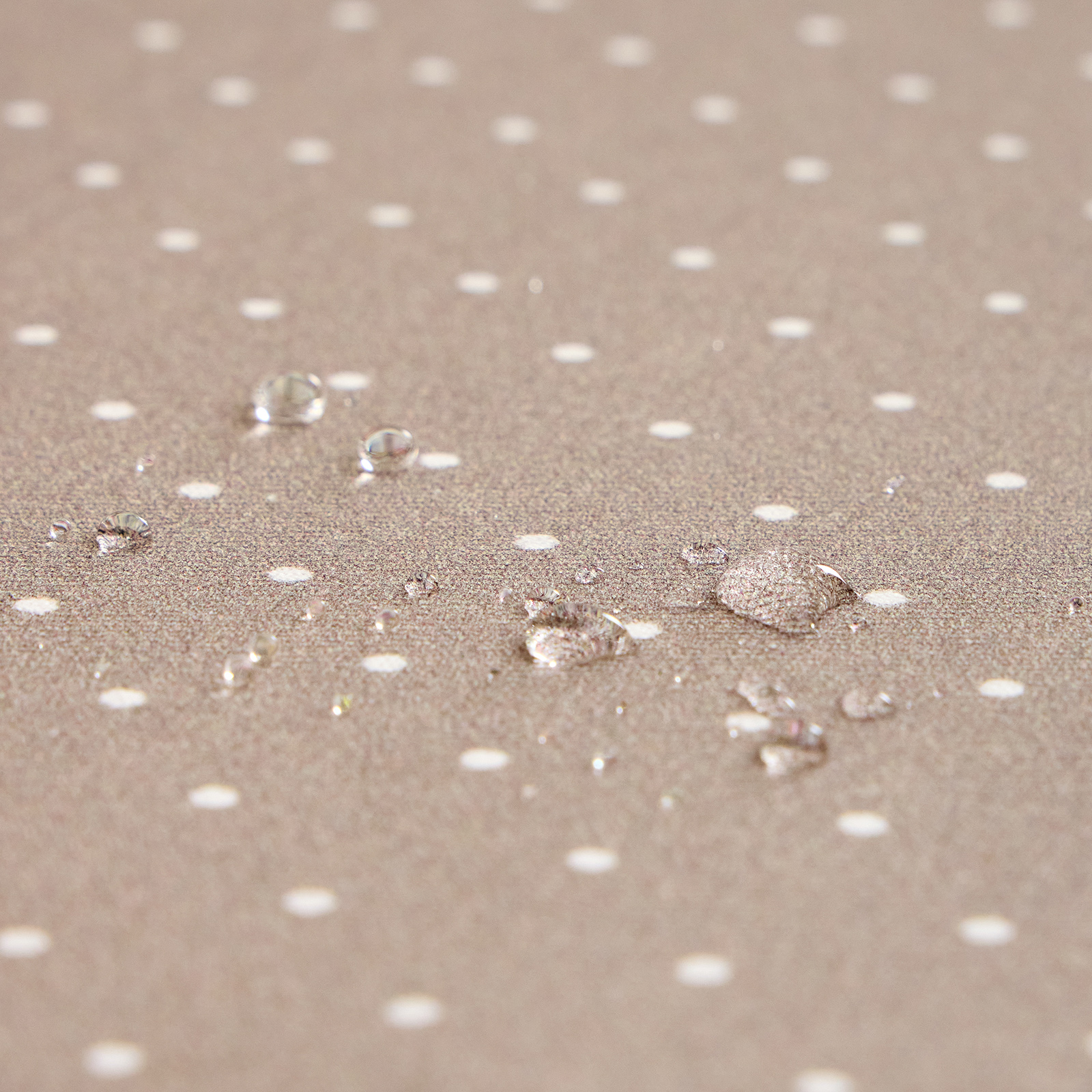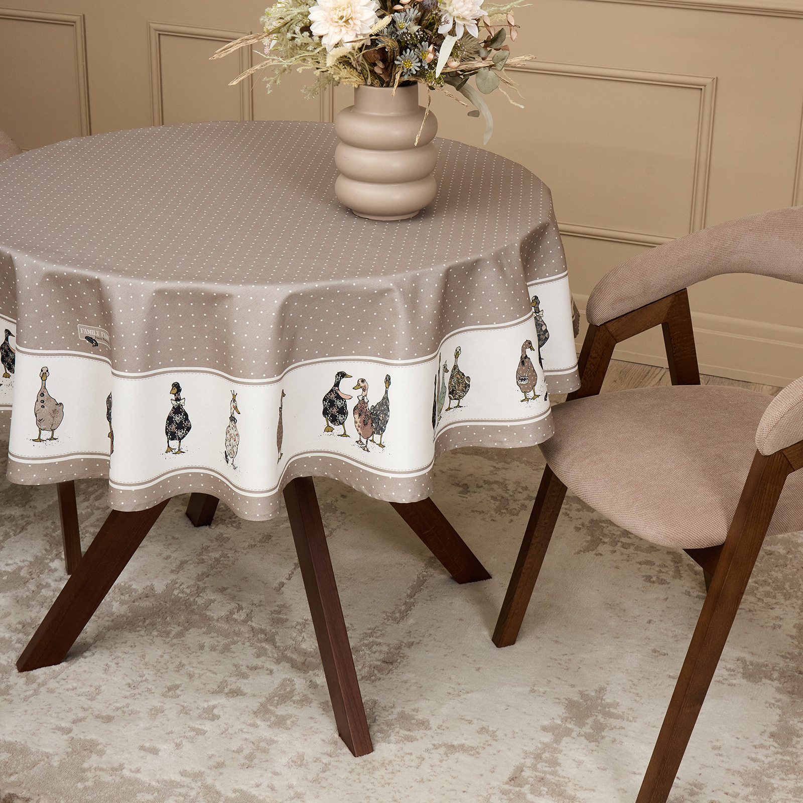 Дизайн в цвете капучино с мелким горохом дополнен декоративной каймой по краю, украшенной изображениями домашних гусей. Принт нанесён методом цифровой печати, что обеспечивает высокую чёткость и стойкость красок даже после многократных стирок.