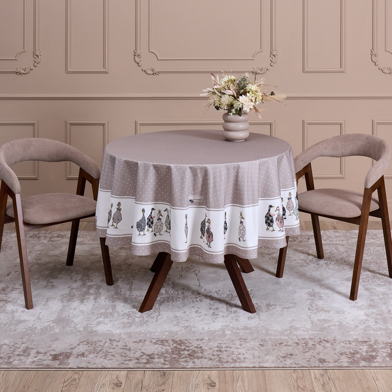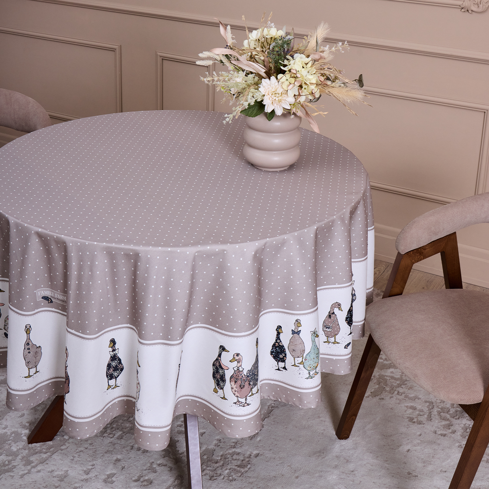 Дизайн в цвете капучино с мелким горохом дополнен декоративной вставкой с изображением домашних гусей — оригинальный принт придаёт интерьеру индивидуальность и тёплую, уютную атмосферу. Скатерть отлично подойдёт для круглых столов диаметром 100–120 см, обеспечивая аккуратный свес. Цифровая печать гарантирует стойкость рисунка даже после многократных стирок.