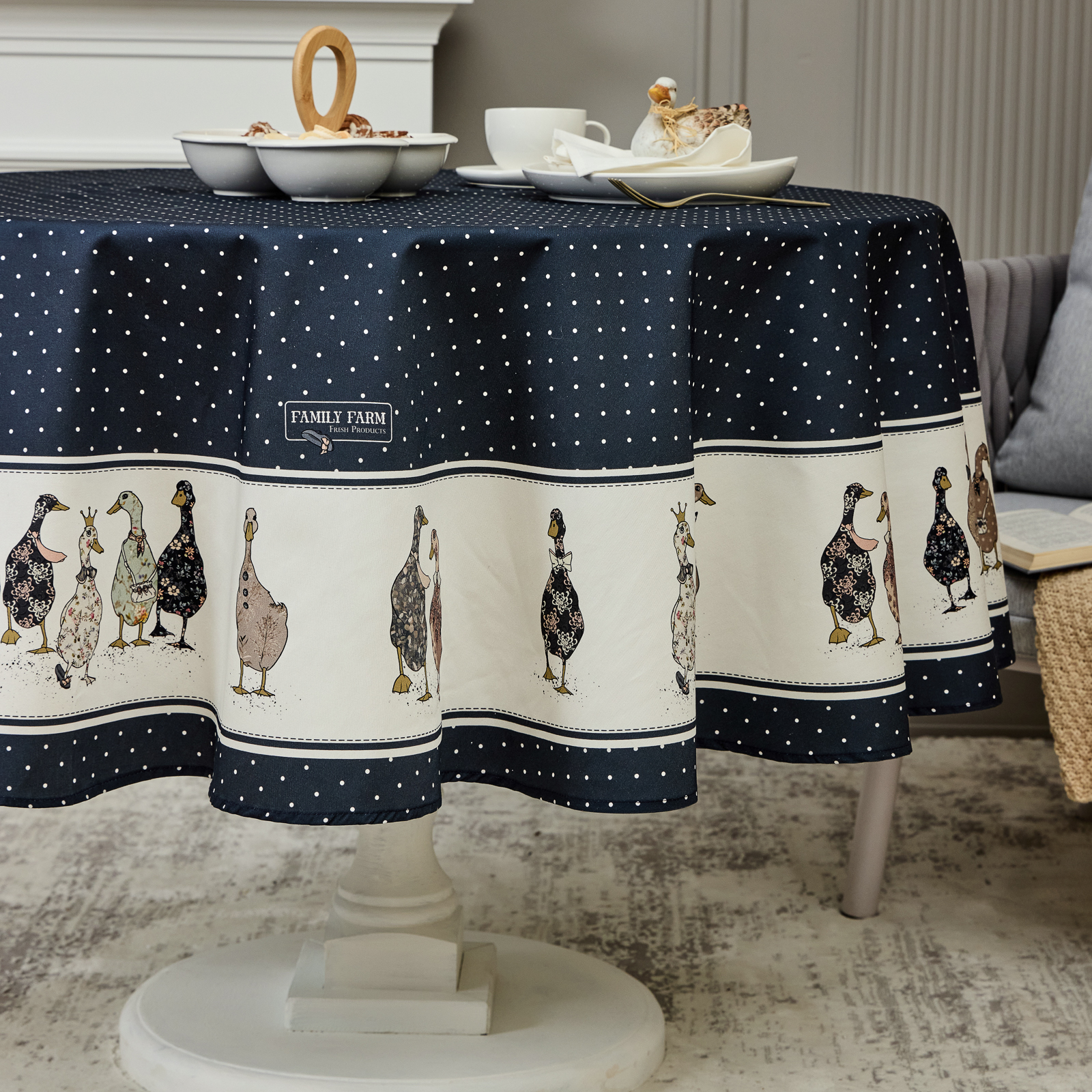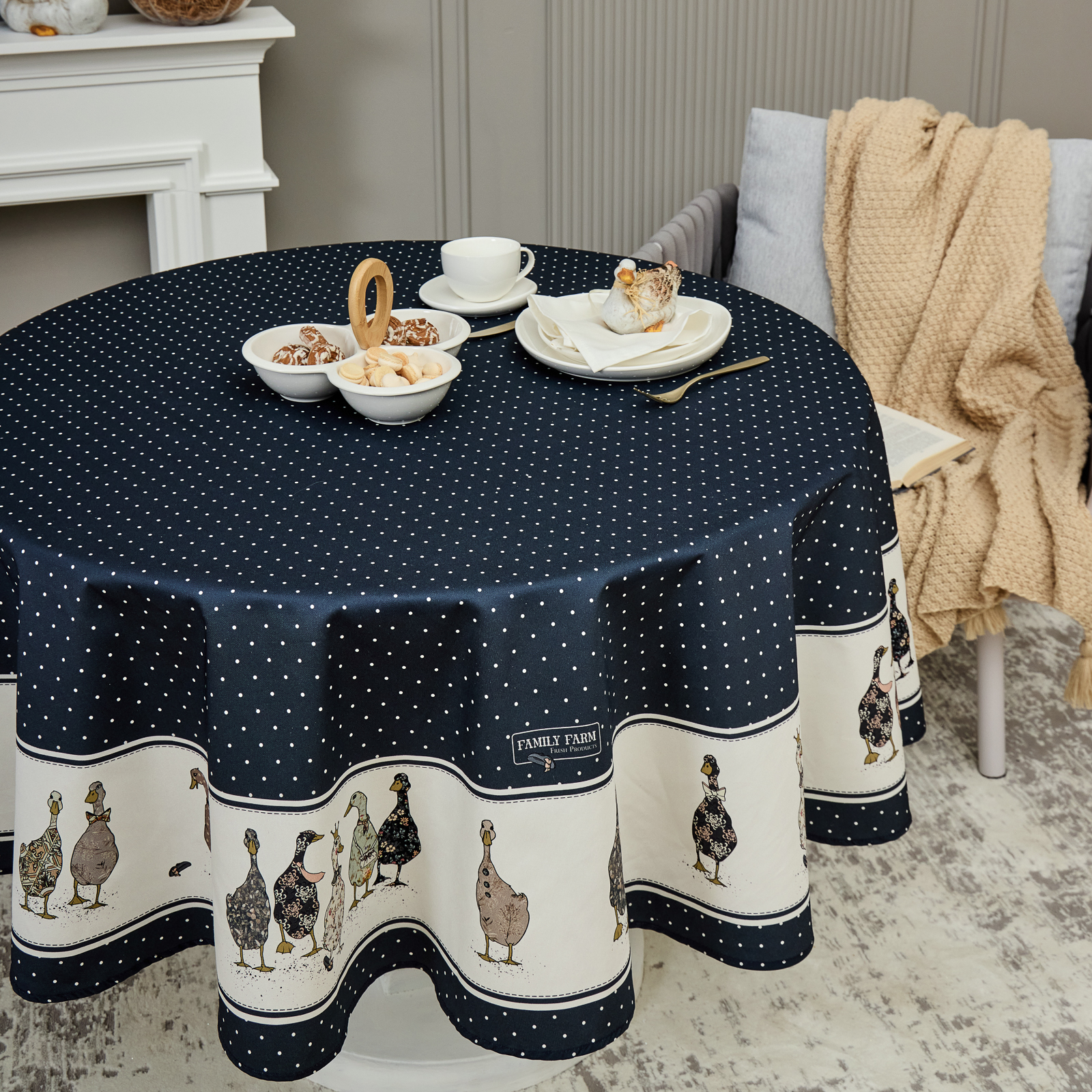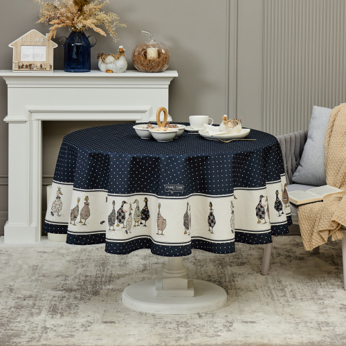 СКАТЕРТЬ КРУГЛАЯ "FAMILY FARM" 190СМ ,СИНИЙ, 100% ХЛОПОК, ТВИЛ, С ПРОПИТКОЙ