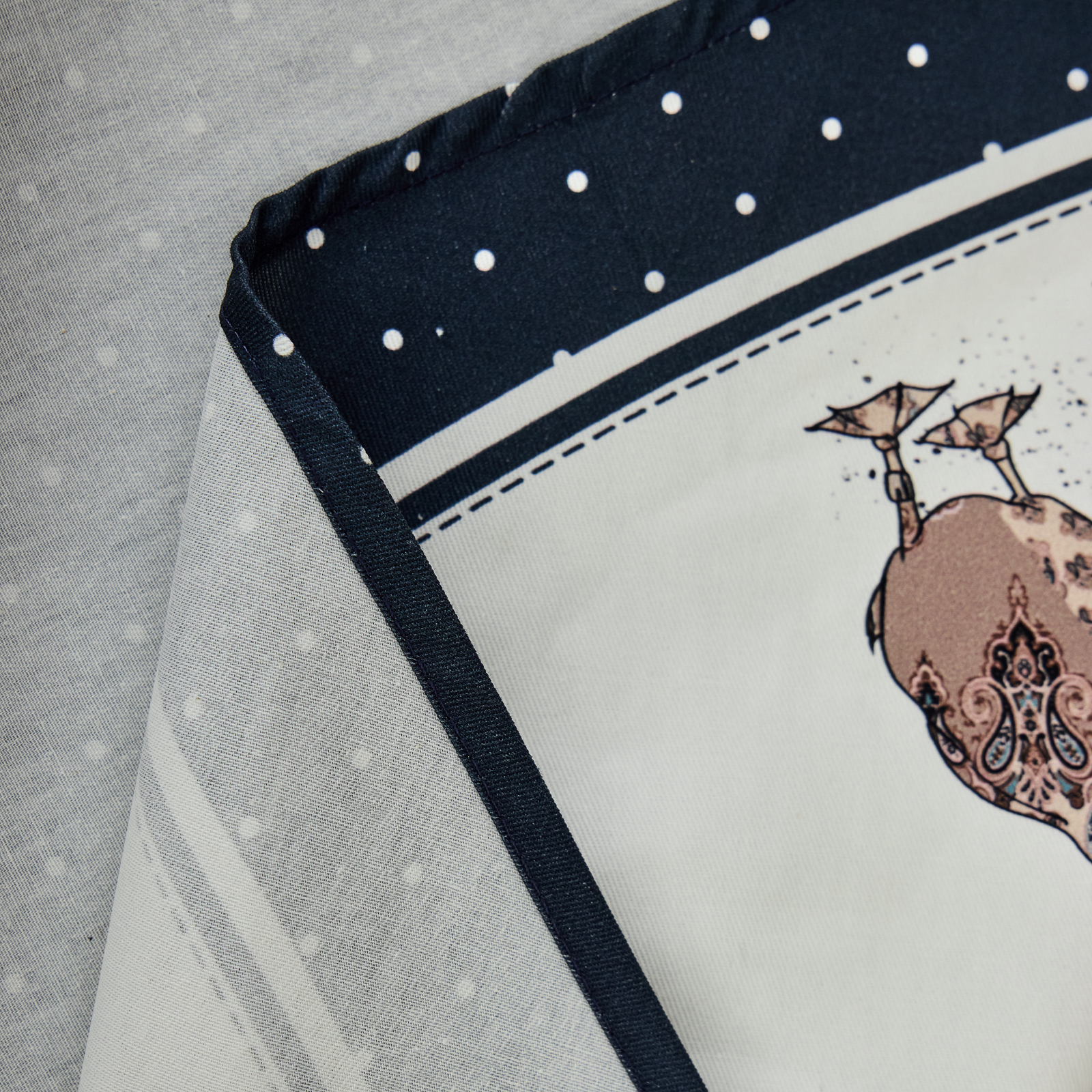 Темно-синяя цветовая гамма в сочетании с декоративным кантом и изображениями гусей придаёт интерьеру уют и характер. Принт создан художниками специально для бренда Lefard — вручную и адаптирован под текстиль в рамках фирменной коллекции. Цифровая печать обеспечивает чёткость и стойкость красок даже после многократных стирок.
